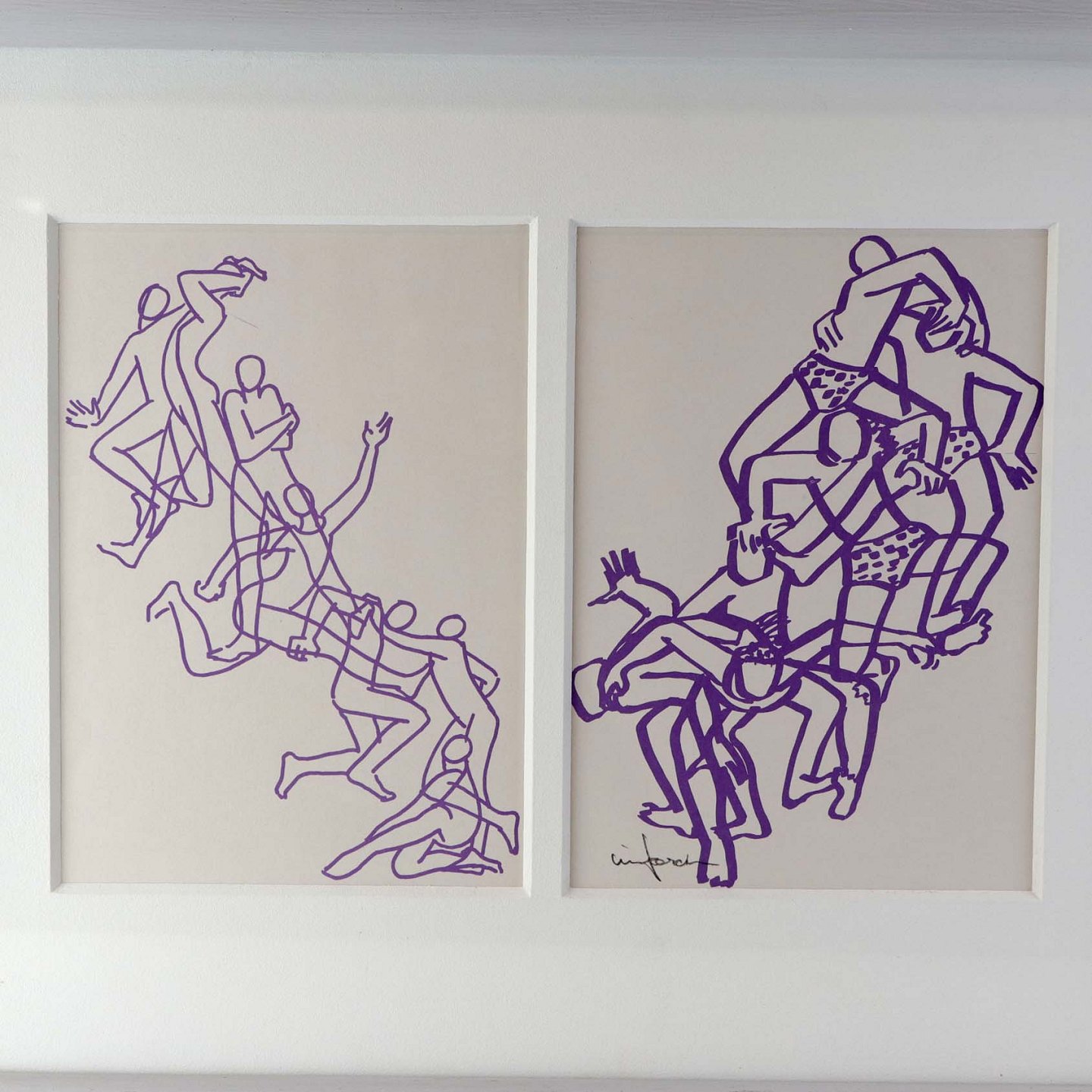Litografi med passepartout i gråmalet træramme og motiv af mennekser i bevægelse i lilla streg.