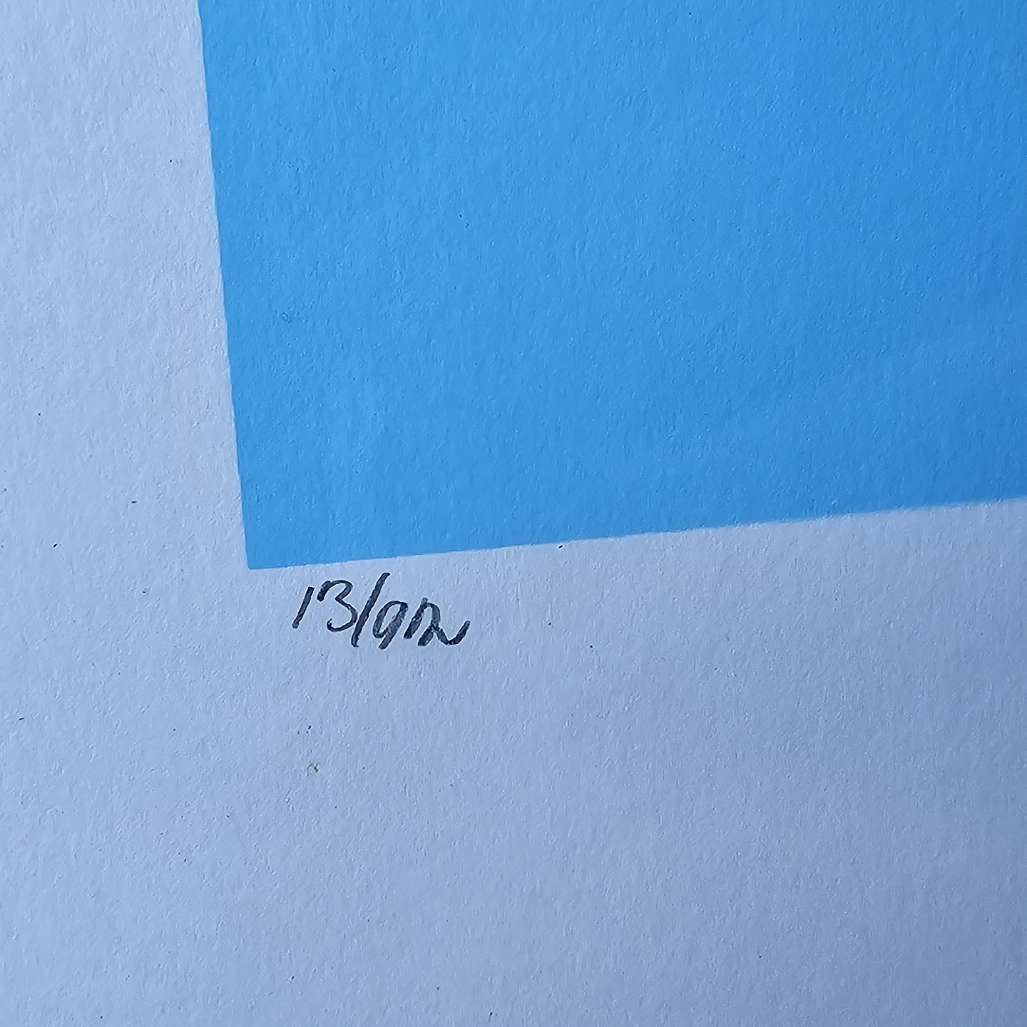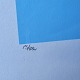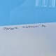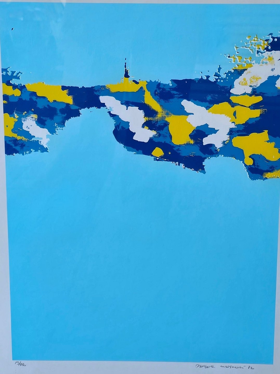 Litografi med abstrakt motiv af Kalvehave og Møensklint i blå, gul og hvid på lyseblå baggrund i metal ramme. 13/45