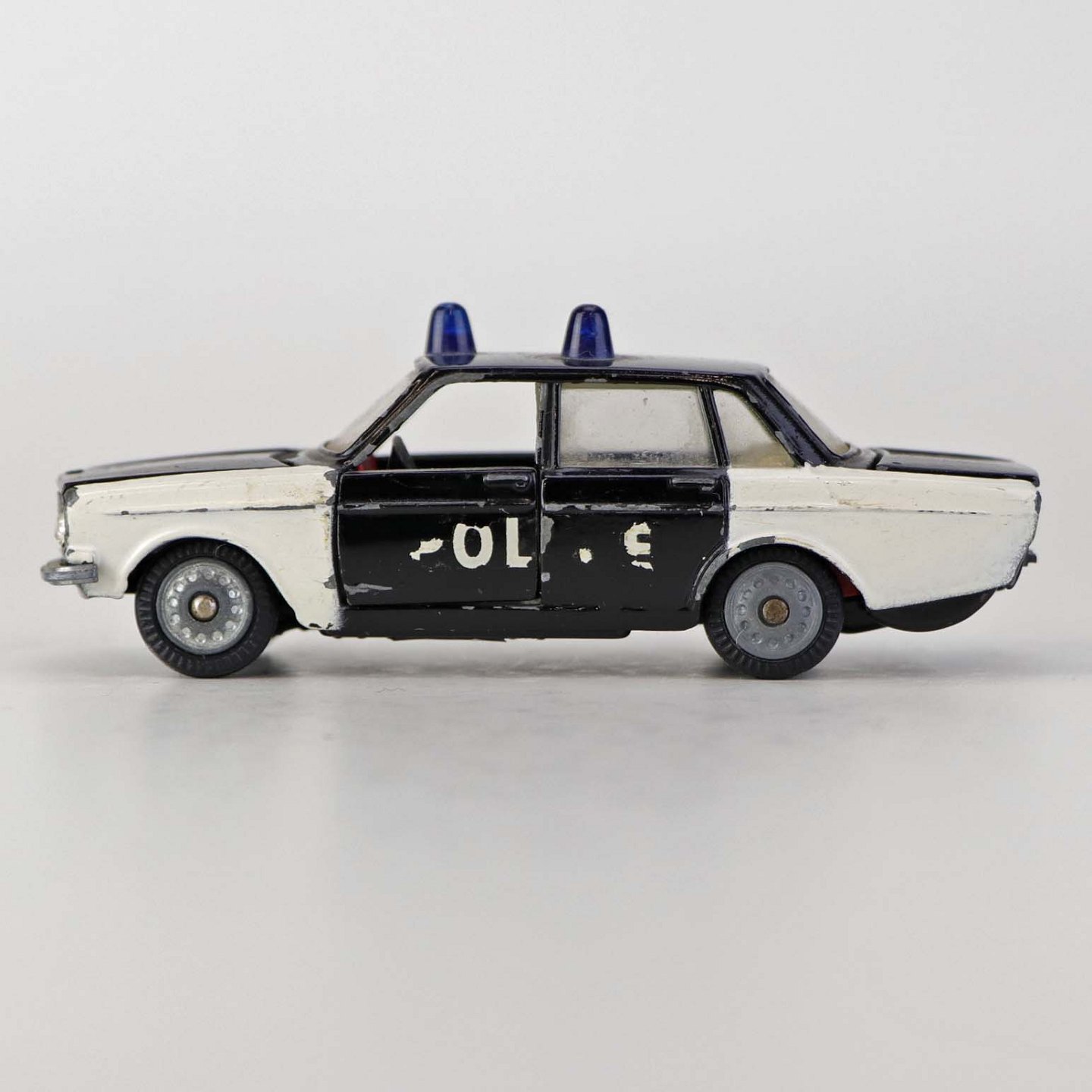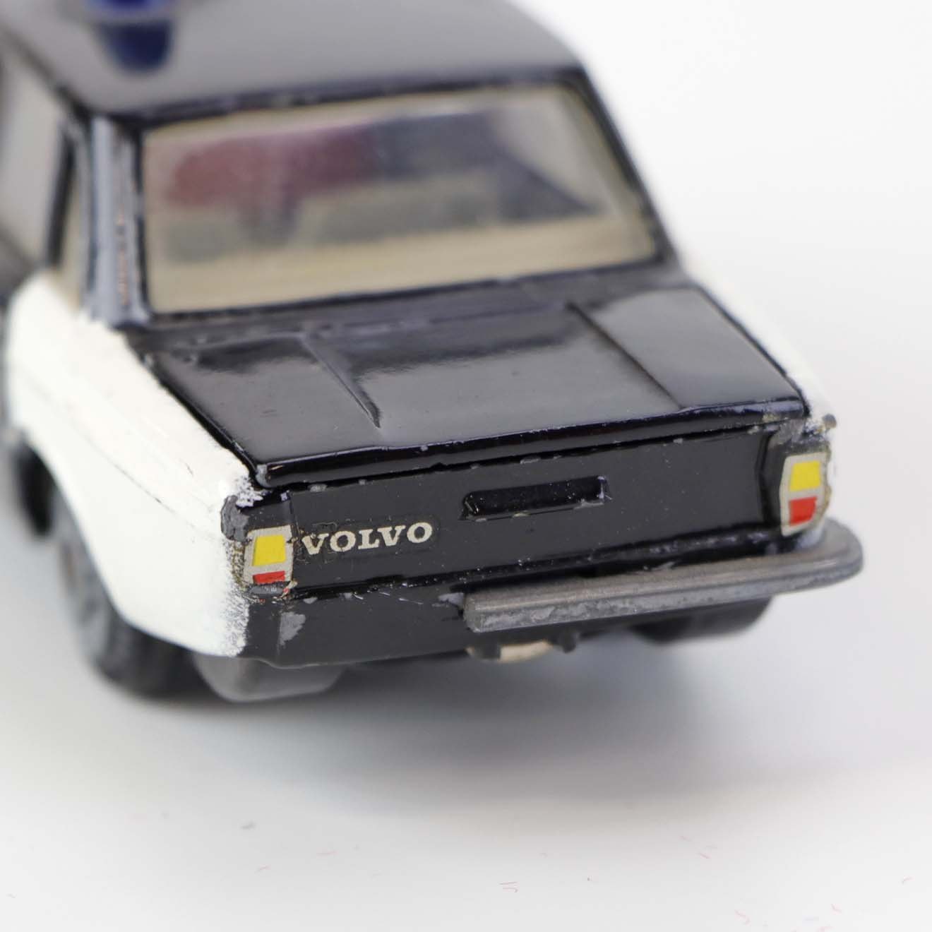 Politibil med to blinklys. Legetøjsbil i sortlakeret metal med gummi hjul og blå blinklys. Model Volvo 144