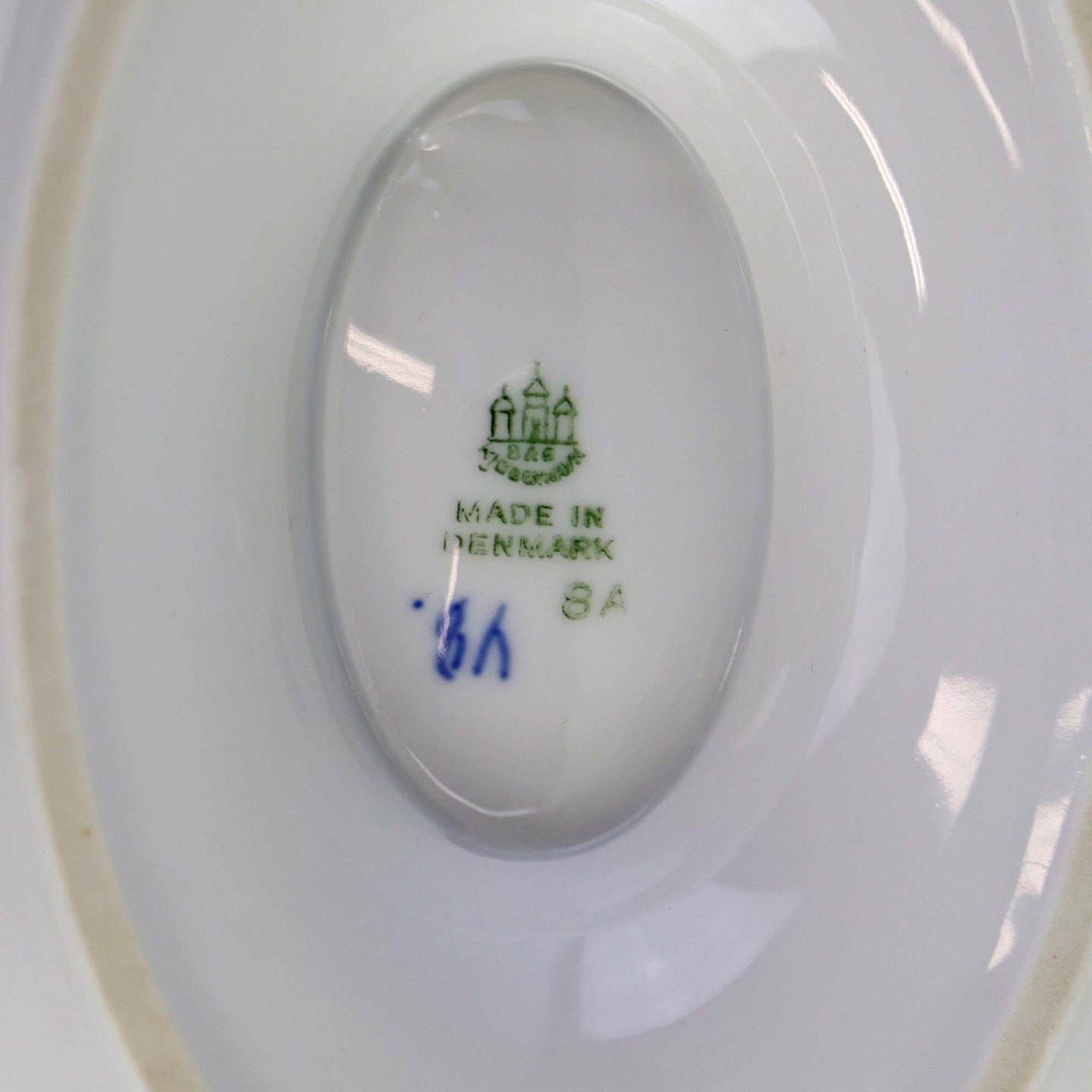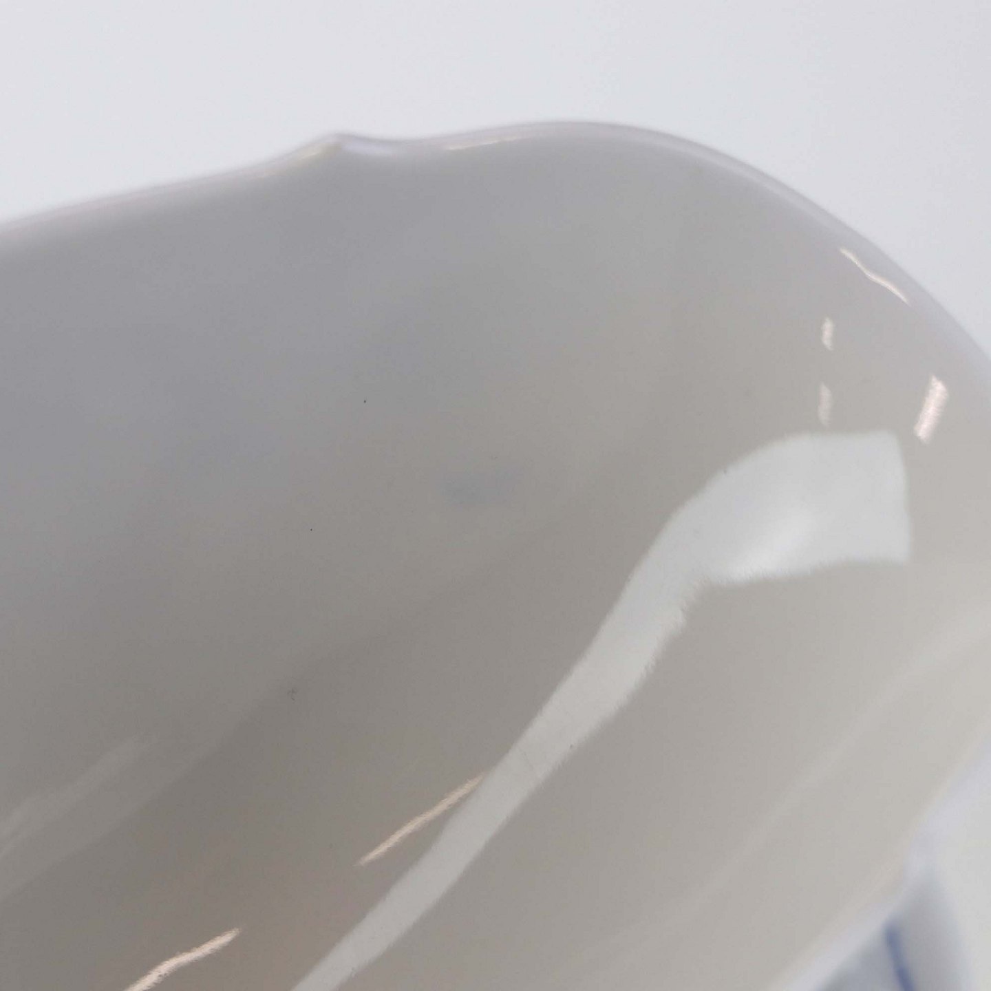 Fremstår med enkelte steder med en svag blå farve under glasuren på indvendig side.