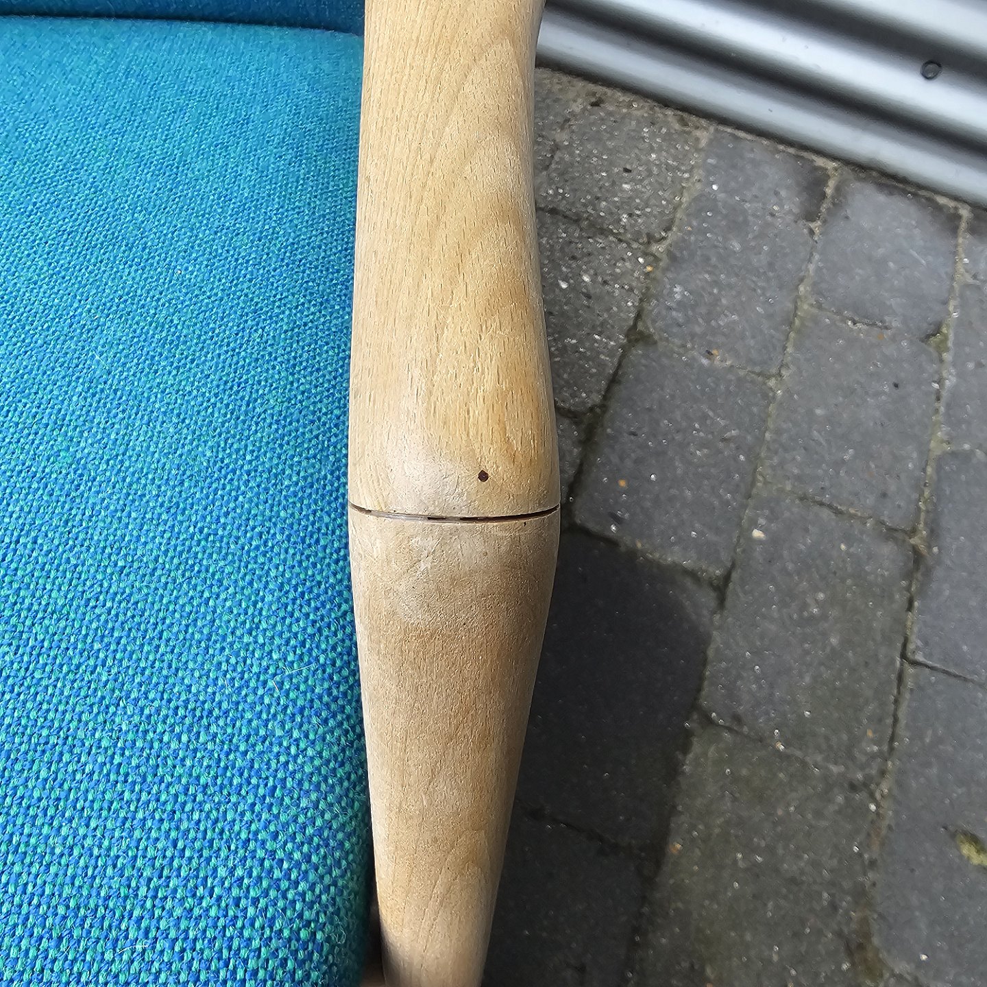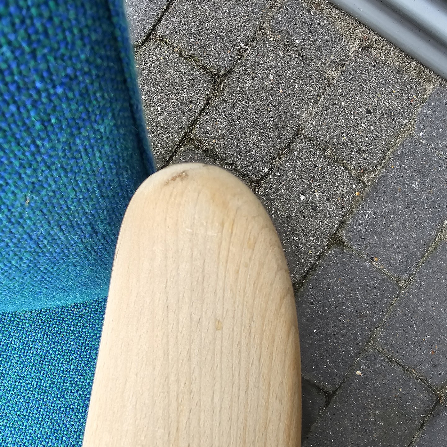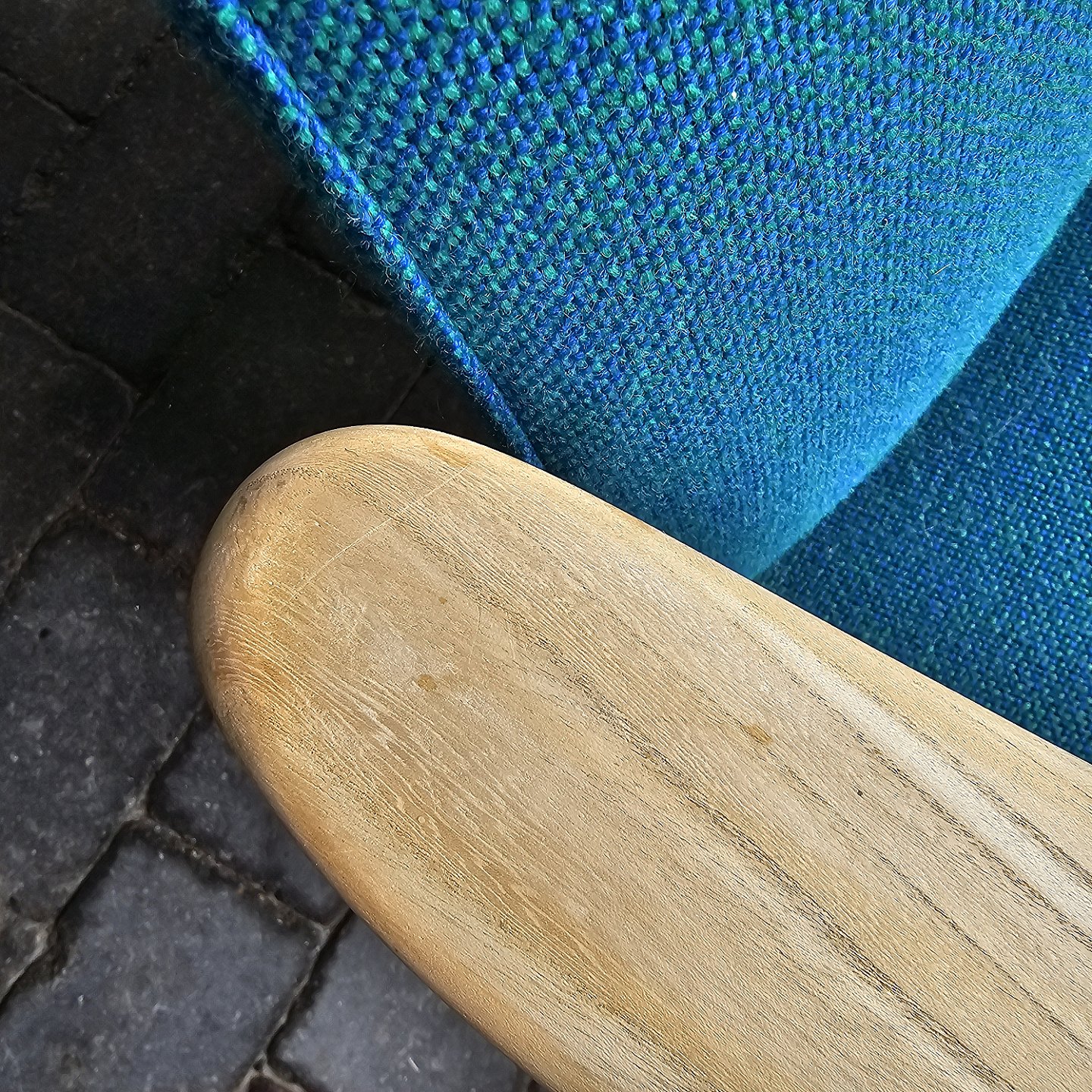 Sæt af to lænestole med træstel og sæde betrukket i blå Hallingdal uld
