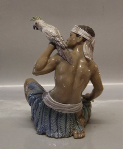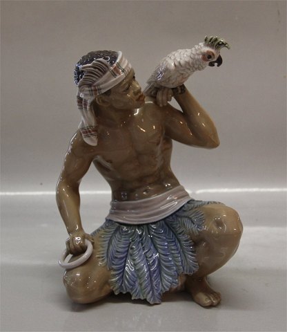 Beskrivelse: Dahl Jensen 1305 Sudaner med kakadue 23 cm (DJ). Orientalsk mand med fugl. Mærket med kongelig krone og DJ Copenhagen i hel og fin stand.1305 Sudanese Man with cockatoo (DJ) 23 cm