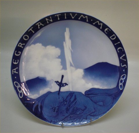 Beskrivelse: Kongelig Porcelænsfabrik Mindeplatte # 29 Geyseir Odd Fellow platte AEGROTANTIUM MEDICUS
