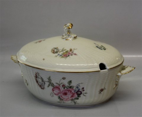 Description: Royal Copenhagen Frijsenborg 1666-910 Tureen with lid ca 19 x 32 cm. Multifloral decoration on curved cream porcelain with gold rim