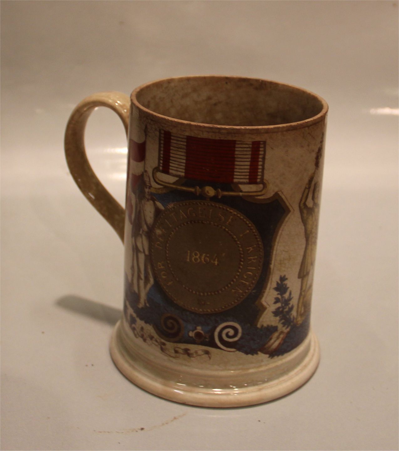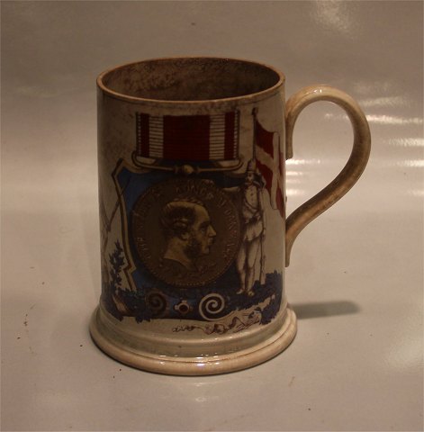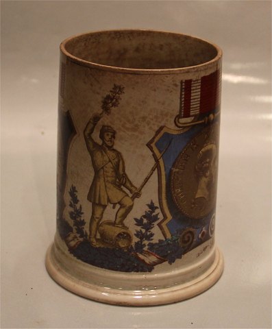Beskrivelse: Aluminia fajance Aluminia kunstfajance Soldaterkrus Mindekrus 1864 15 cm Produceret 1882 Krakkelering og brugsspor se billede