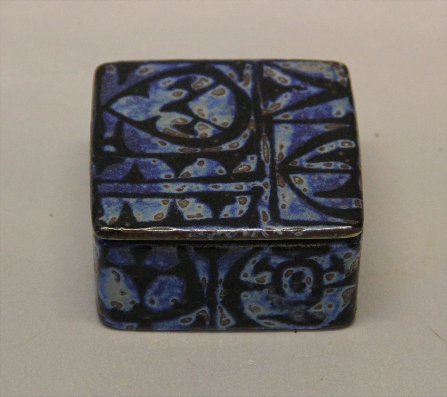 Description: Aluminia Copenhagen RC Faience 704-3267 Dark Blue lidded box, square 4 x 8 cm , Baca, Nils Thorsson 1963