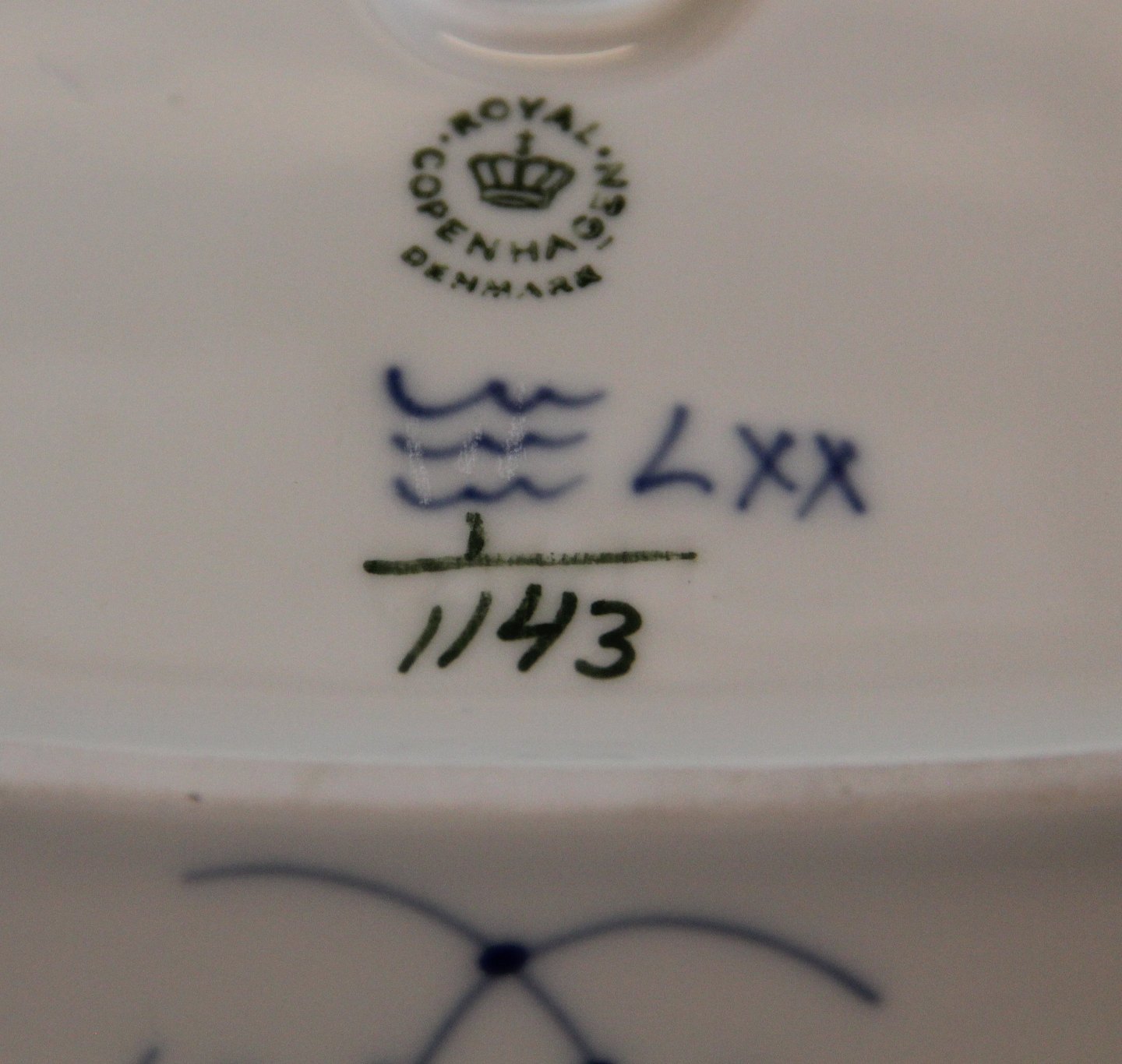 Beskrivelse: Kongelig Dansk Porcelæn Musselmalet Helblonde 1143-1 Brødbakke, firkantet 23 x 31 cm (420) 2. I fin og hel stand