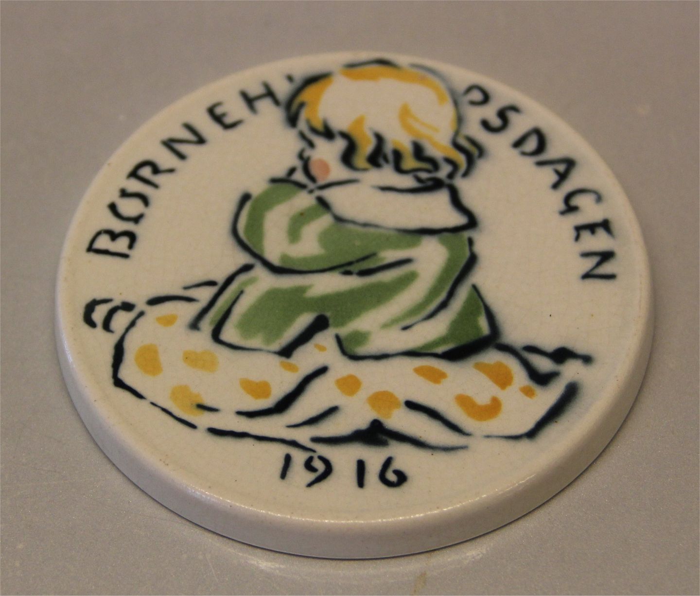 Description: 1916 b Child Sitting 8,7 cm Oscar Willerup 1916 Royal Copenhagen Aluminia Faience Children days plates Child Welfare plates