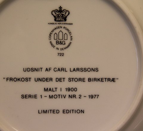 Bing & Grøndahl Carl Larson B&G 8722 1977 Carl Larssons platte - serie 1 - motiv nr. 2 "Frokost under det store birketræ" Malt i 1900, 21,5 cm