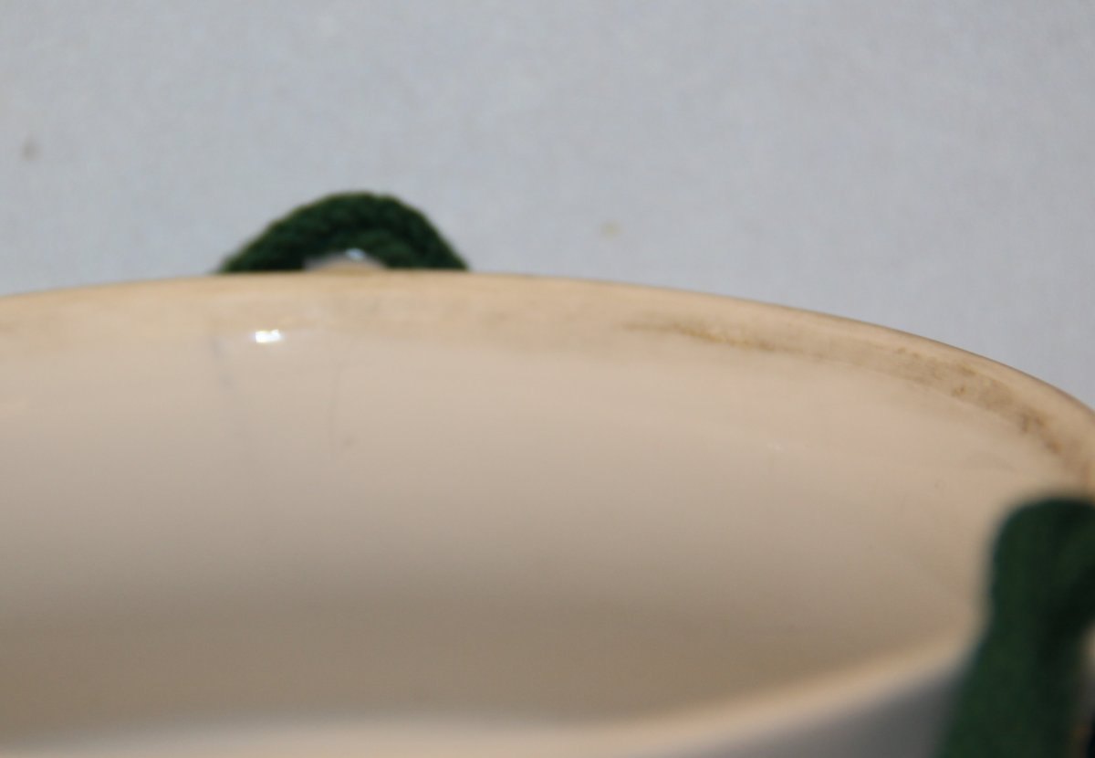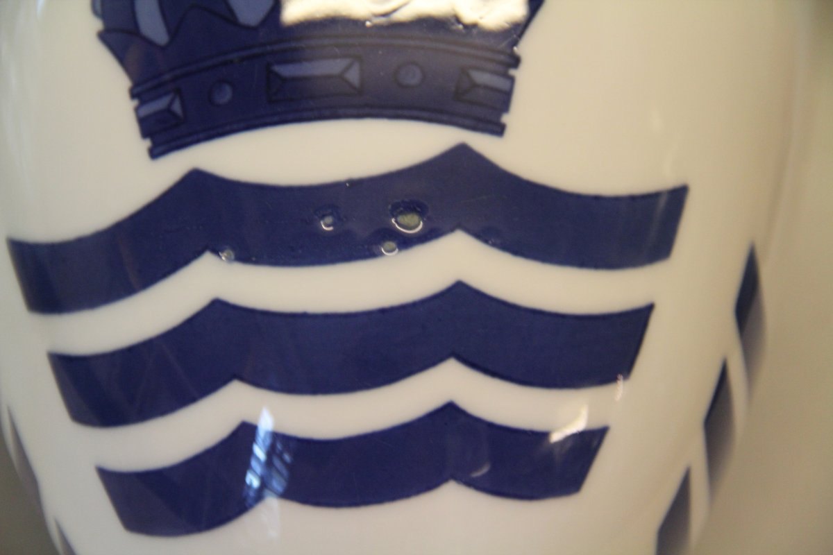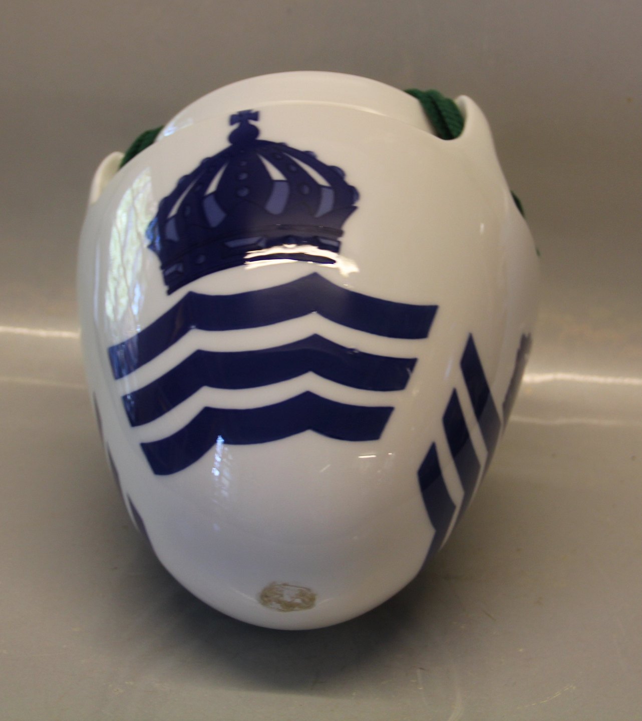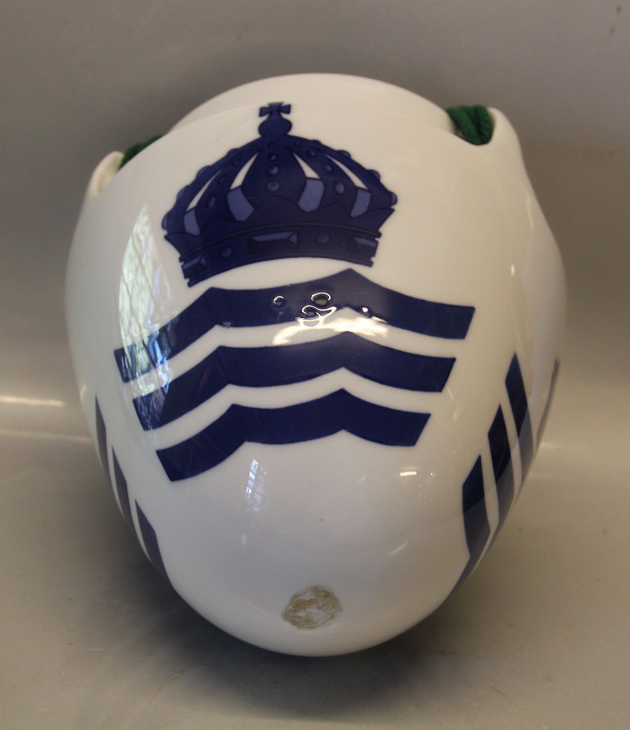 Beskrivelse: Kgl. Art Nouveau Kgl. Hængevase med tre bølgelinier og krone 24 x 20 cm 3 håndtag - glasurfejl se fra Royal Copenhagen glasurfejl se billeder
