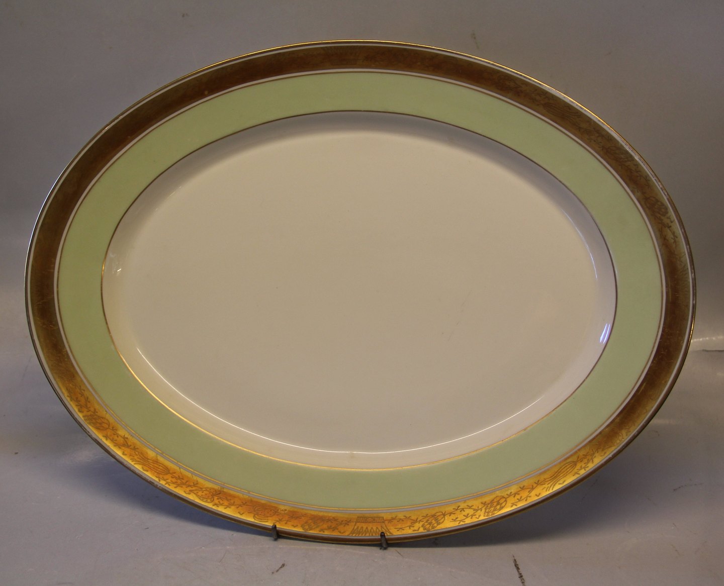 9585-988 Fad, ovalt 30 x 40 cm Dagmar spise- og kaffestel fra Den kongelige Porcelænsfabrik. Grønt porcelæn med bred guldkant med ciseleret relief af stiliserede planter og krone. I fin og hel stand Design Thorkild Olsen 1938