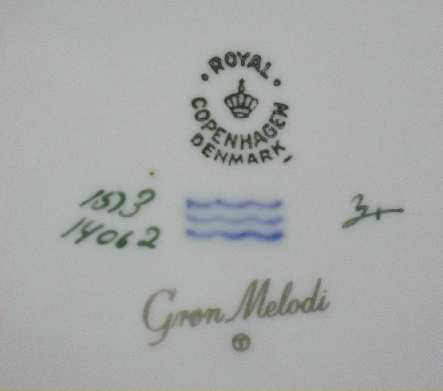 1513-14062 Dyb tallerken 23 cm Grøn Melodi #1513 (Kgl.) Rillet form, hvid glasur, grøn dekoration, grønt båd og guldfilet.