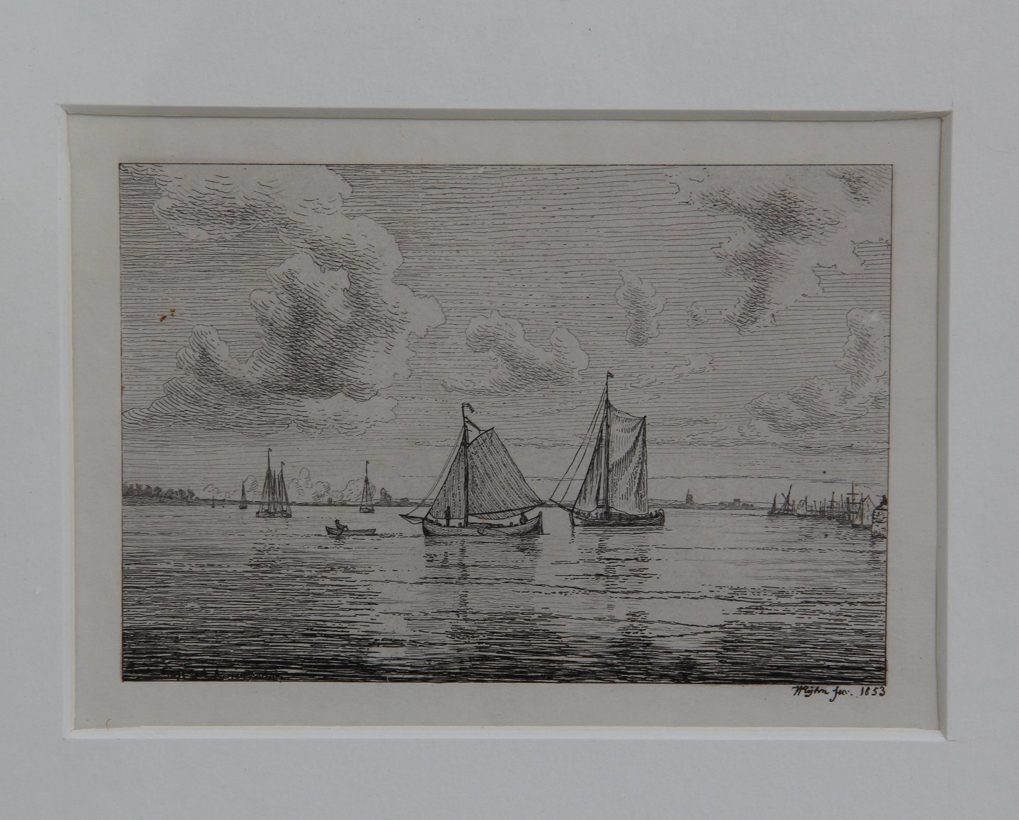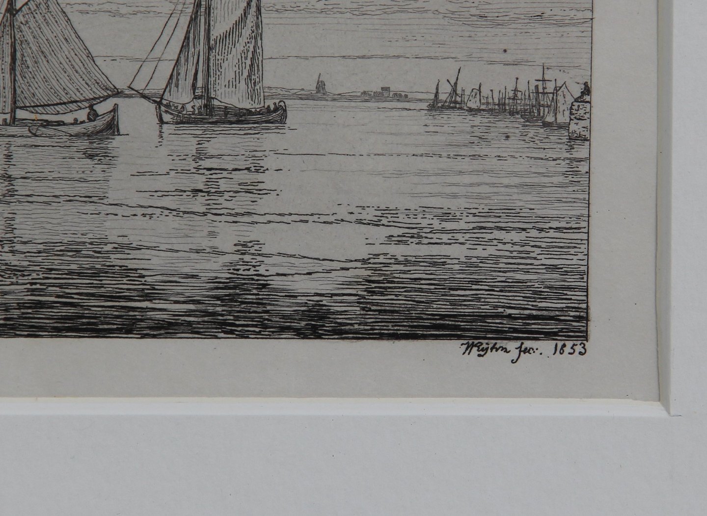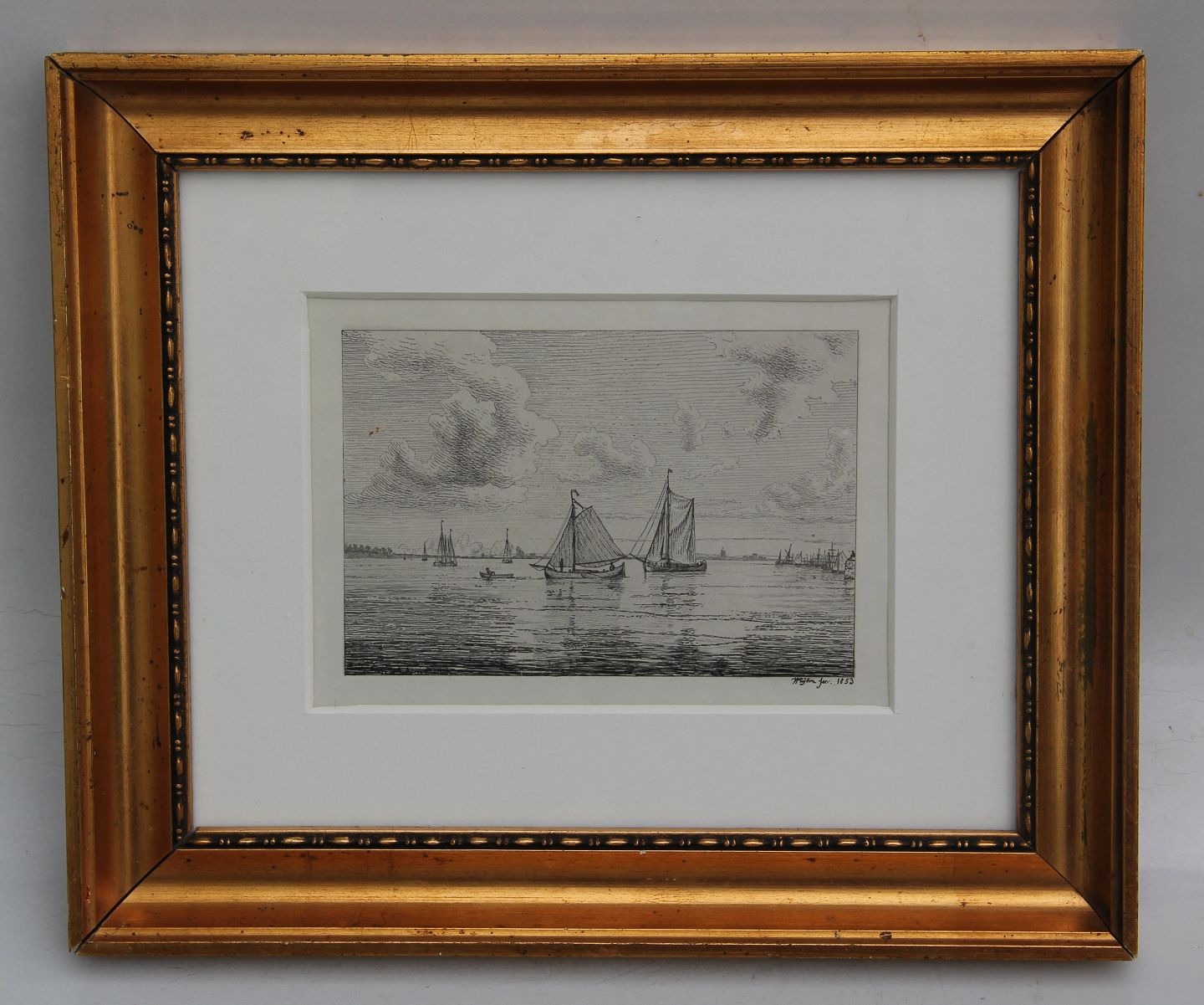 Radering: Wilhelm Kyhn 1853 Marine - skibe 25 x 29.5 cm i guldramme
