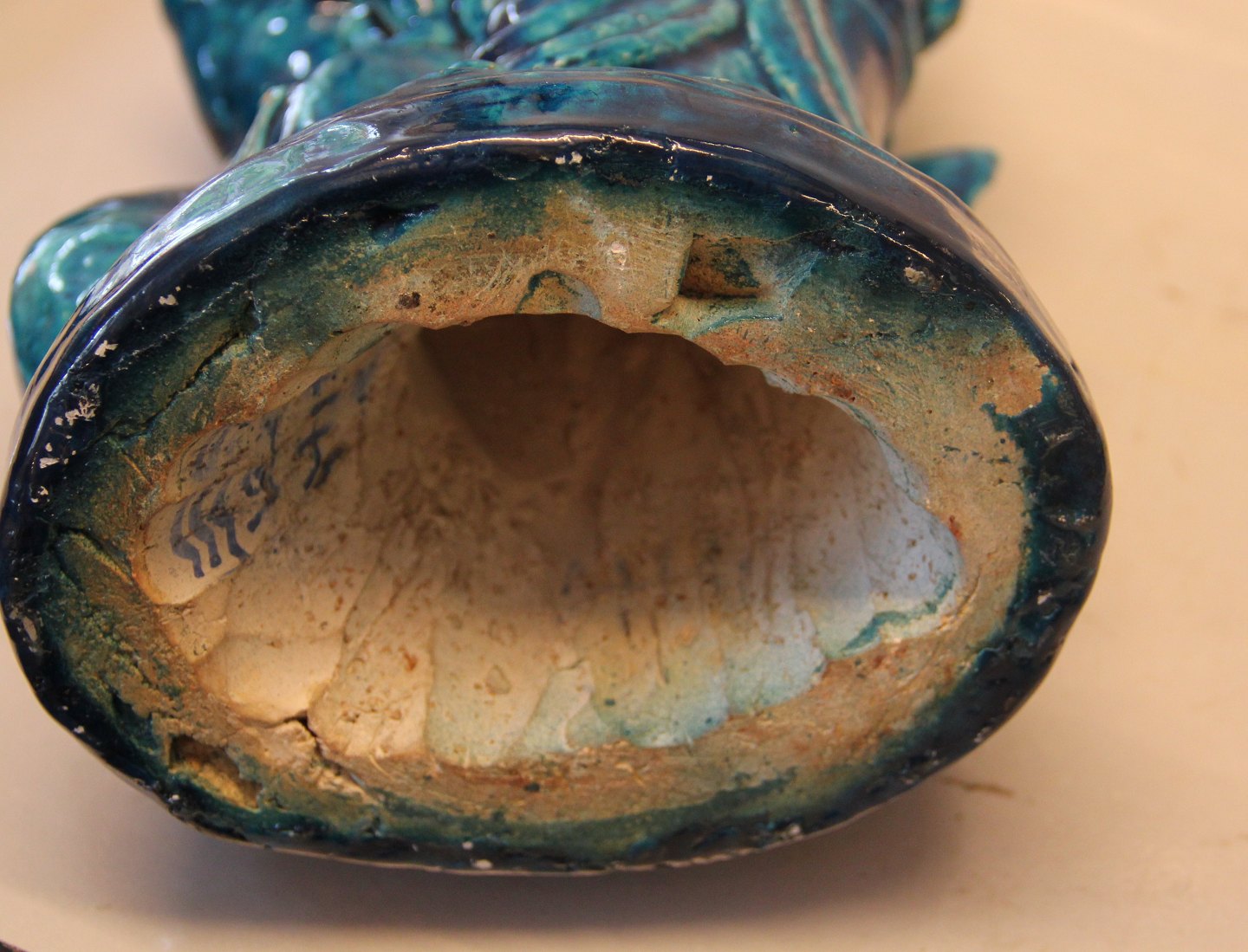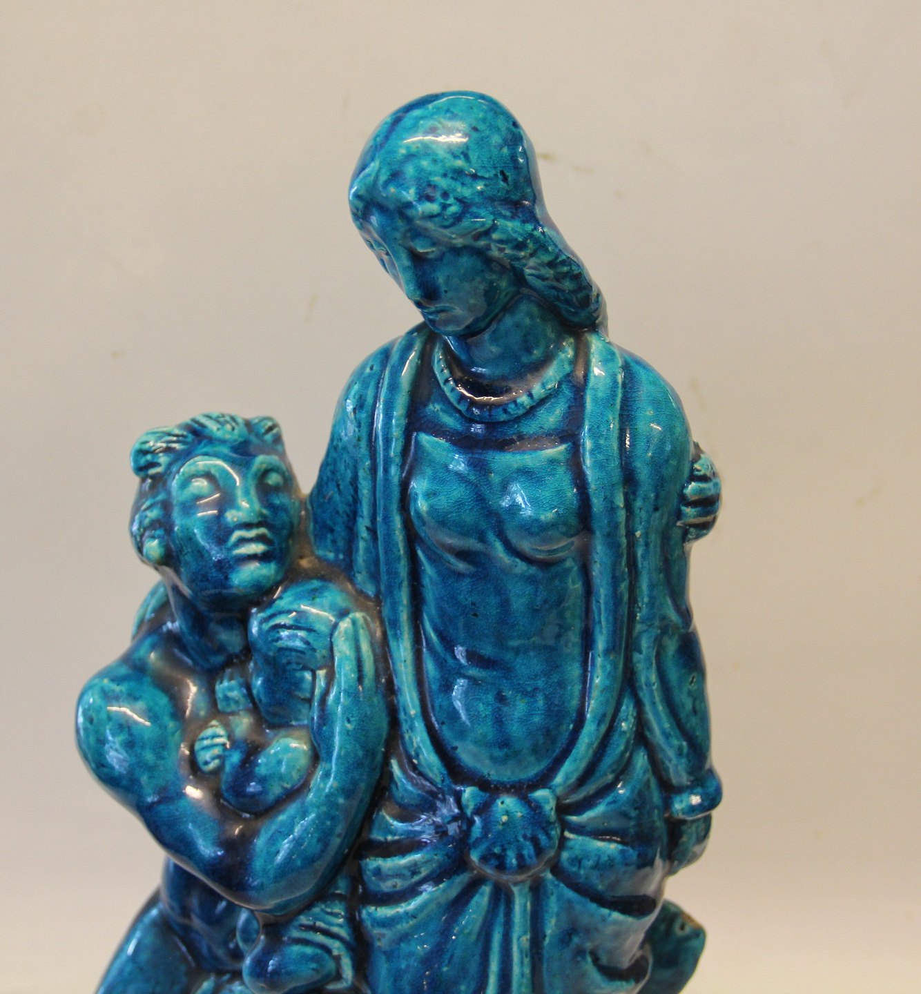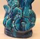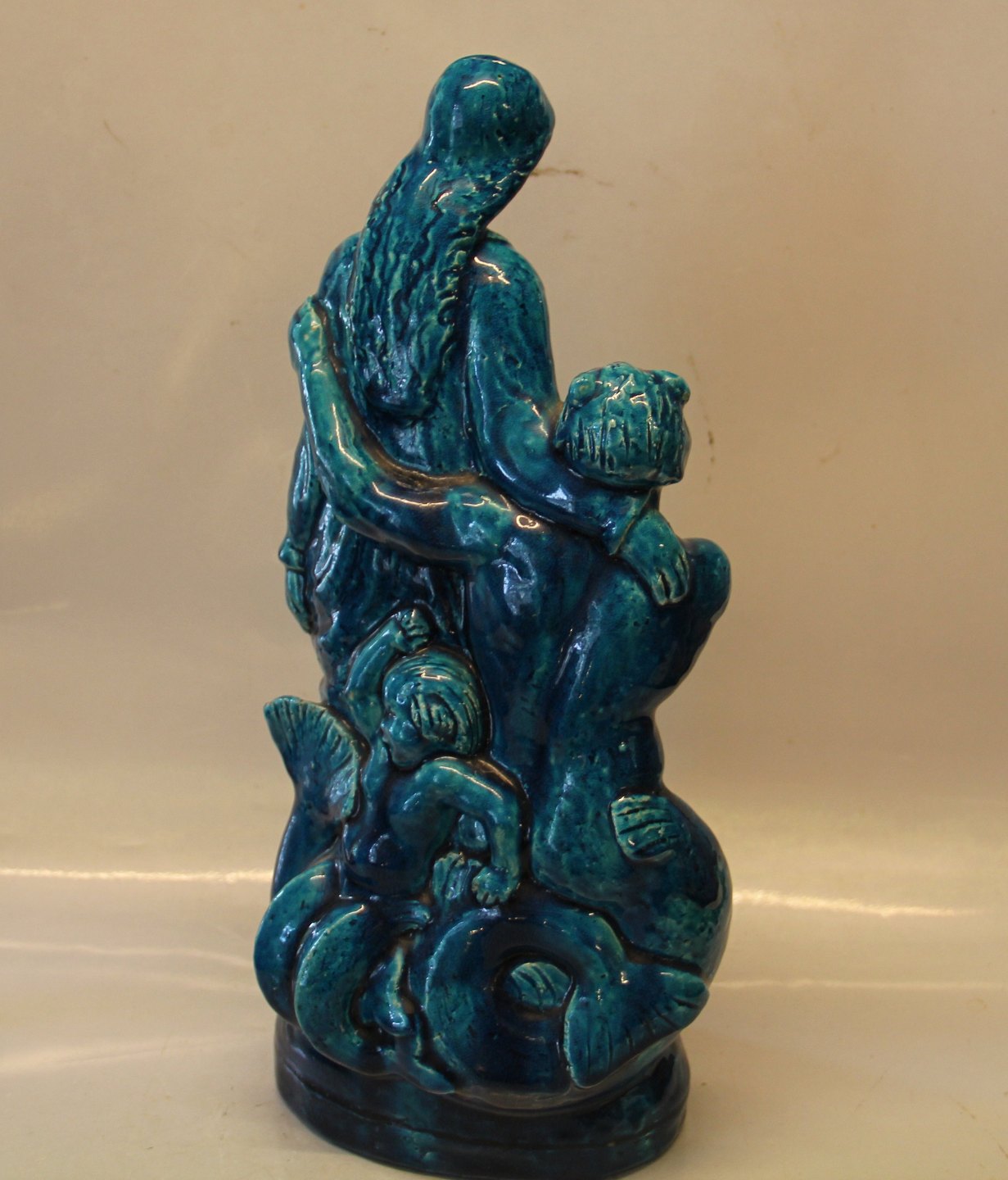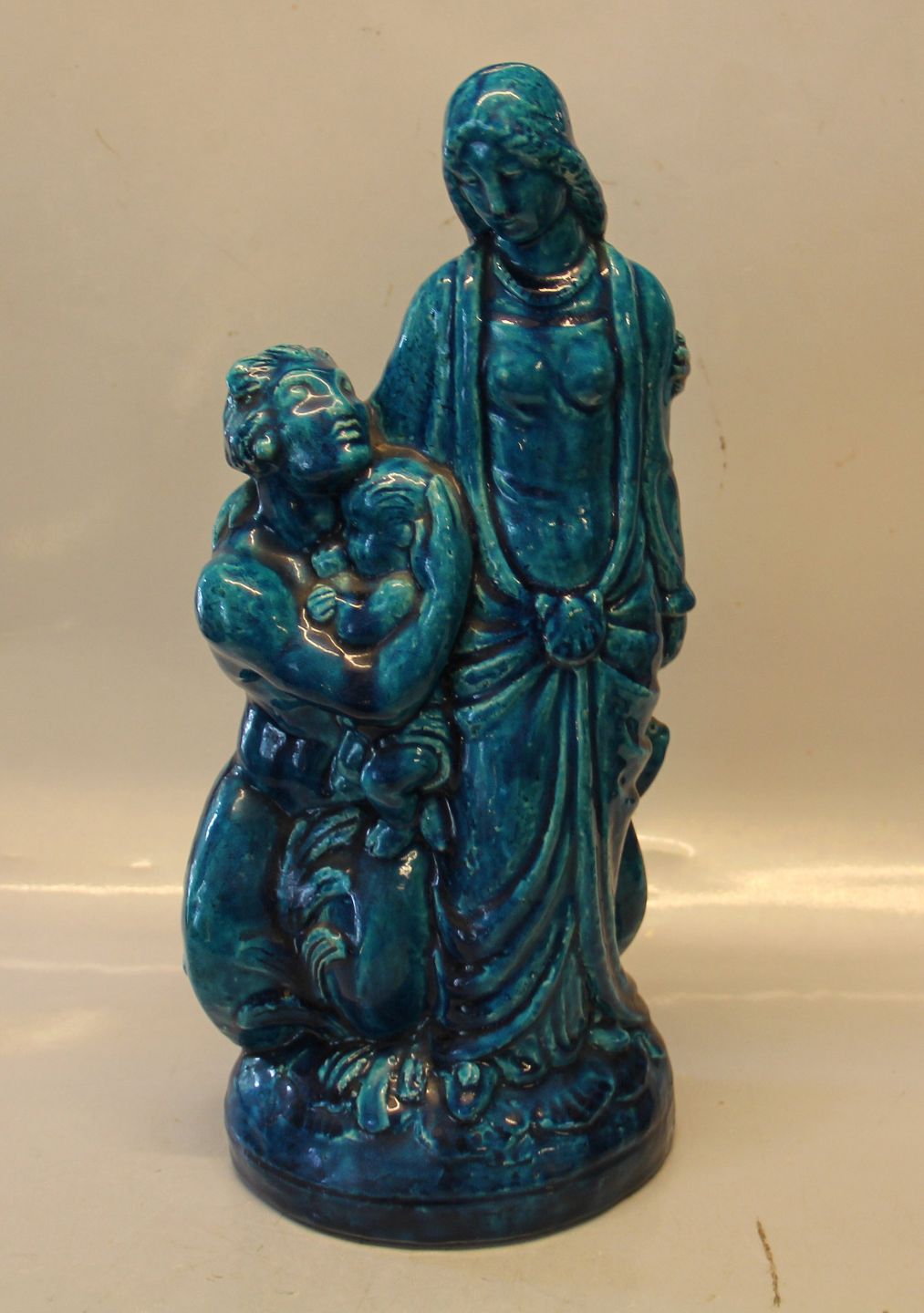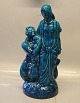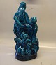 Kongelig Dansk Stentøjsfigur i Turkis glasur 41 cm Kvinde med barn og havmand med havdreng Signeret HHH