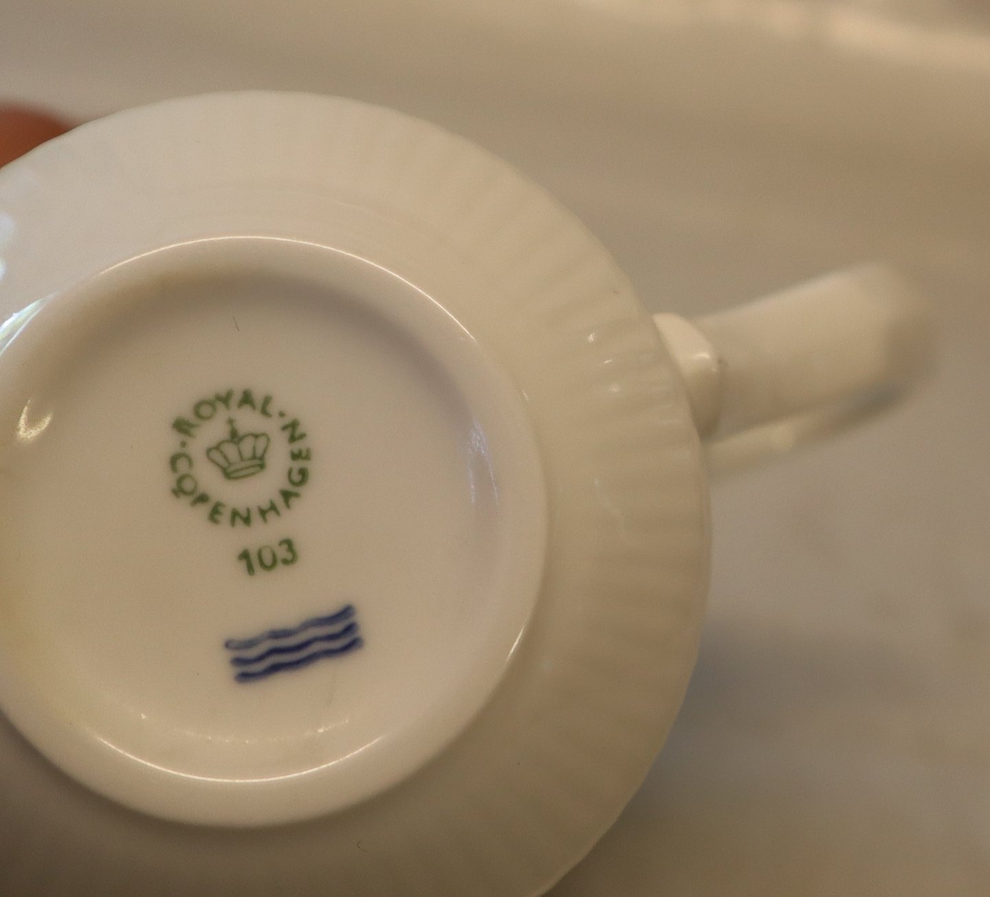 Royal Copenhagen Hvid riflet . I fin og hel stand. Passer godt sammen med andre musselmalet og blåmalede spise- og kaffestel