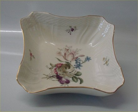 Beskrivelse: Royal Copenhagen Frijsenborg 1522-910 Kartoffelskål 21 x 21 cm Blomstermotiver på svejfet stel med guldkant.