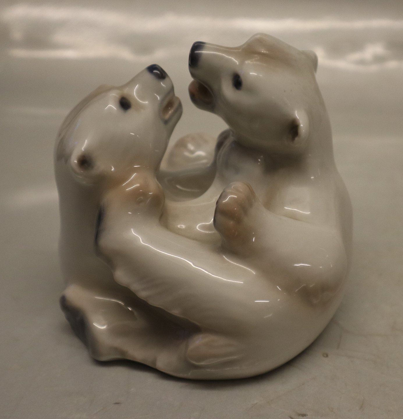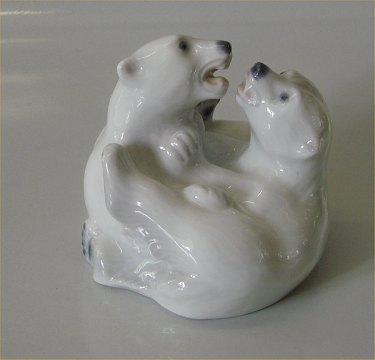 Description: Lyngby Porcelain 90 Lyngby Two Polar bear cubs playing 11 x 12 cm. Marked with a Royal Crown Handpainted, Copenhagen Made in Denmark. The stamp of Copenhagen Porcelain Painting Factory (KPM). In mint condition