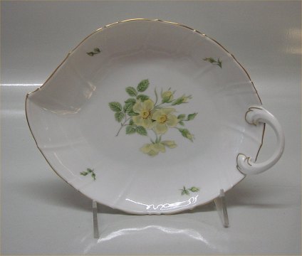 Beskrivelse: Bing & Grøndahl Klitrose 199 Bladformet, (stor) 25 cm (357) Hvidt kantet porcelæn med bred guldkant og klitrose. I hel og fin stand