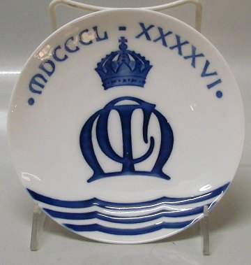 Prins Carls bryllup med Prinsesse Maud af Storbritannien og Irland. Kronet monogram CM og årstal MDCCCLXXXXVI. F.n. tre bølgelinier. Design: Arnold Krog 1200 Ekspl., 17,5cm