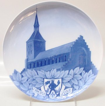 Description: Royal Copenhagen Collector Plate # RC-CM82 1907 The cathedral of Saint Knud in Odense viewed from the southeast. Below a leaf motif with the city arms and inscription: ODENSE 1908. Designed by: Arnold Krog 212 copies, 11”, 28 cm