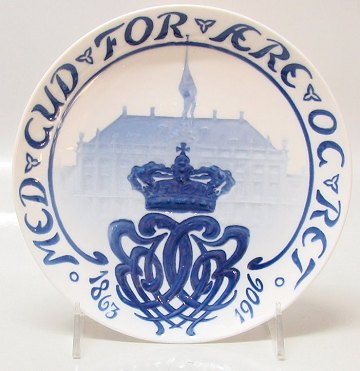 Beskrivelse: Bing & Grøndahl Mindeplatte #22 King of Denmark from 1863 - 1906 Christian IX's memorial plate: Med Gud for ære og Ret 1863 -1906. Crown & Monogram Amalienborg in the background 21 cm