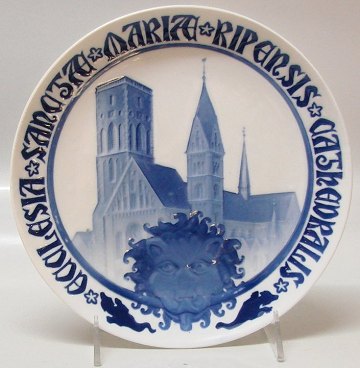 Beskrivelse: Bing & Grøndahl Mindeplatte #28 Ribe Cathedral: TEXT IN LATIN: ECCLASIA SANCTO MARIA RIPENSIS CATHEDRALIS (23 CM) Designed 2-1-1908 by Dahl Jensen CM28
