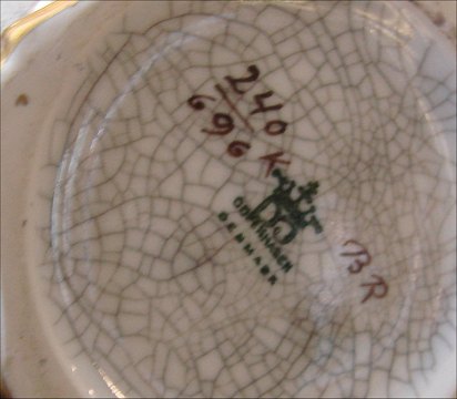 Like several other Chinese glazes cracquelé gained a huge popularity in Denmark in the late 1920s. For the World Exhibition in Paris the Royal Copenhagen Porcelain Manufactory had created several vases in the distinguished crackled glaze and both Royal Copenhagen, Bing & Grondahl and Lyngby porcelain quickly produced large series of vases, bowls and dishes in characteristic grey crackled glaze. Allowing different rates of shrinkage during the firing resulting in a network of cracks before it is decorated produces the glaze. The color is the applied into the cracks and further protective glaze is applied. Also Dahl Jensen followed that trend, but they did it entirely in their own way. Georg had achieved great results with cracquelé as early as 1928. While it can be hard to distinguish the other factories’ productions Dahl Jensen’s are set apart in many important aspects. Dahl-Jensen cracquelé has dark manganese markings in larger areas. Besides it has a different abundant decoration. It was mainly Crista Dahl-Jensen who made the hand painted overglaze decoration and these were often changed and renewed. The special glazes were made at the factory. The series of grey cracquelé was soon broadened with both a green and a red stock and a gold border. The blue colour, which none of the competitors had, was not created until the late 1950s (From the English summery of Dahl Jensen book by Bolette Bramsen)