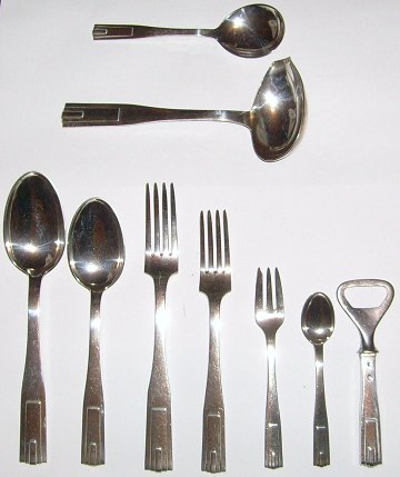 Description: Hans Hansen Arvesølv 11 Silver Flatware. Done in a nice Art Deco design. Is in very good used condition.