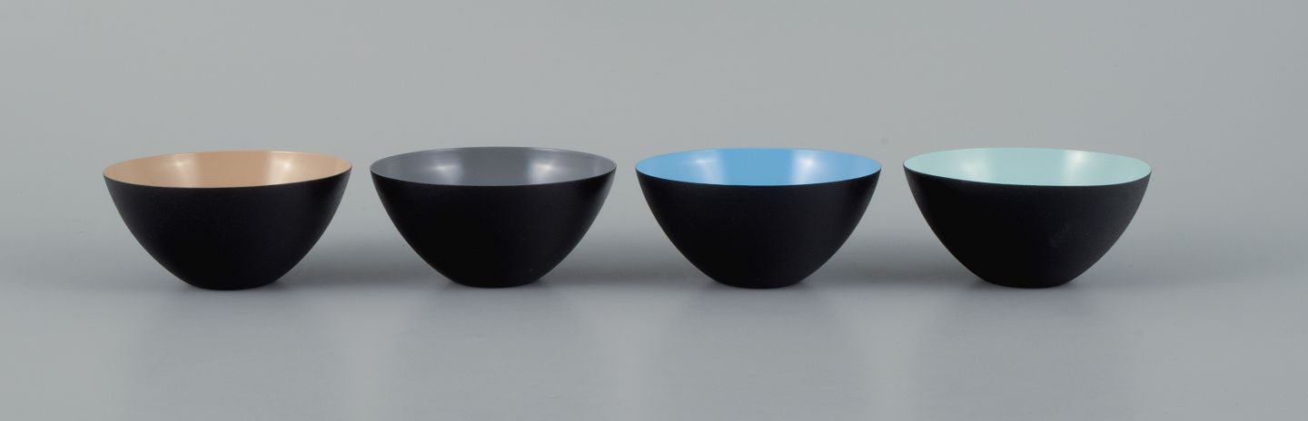 Four small bowls in metal. Brown, grey, blue and mint green. Design by Hermann Krenchel. 2000s. In perfect condition. Signed "Normann Copenhagen" Dimensions: D 8,5 x H 4,0 cm.