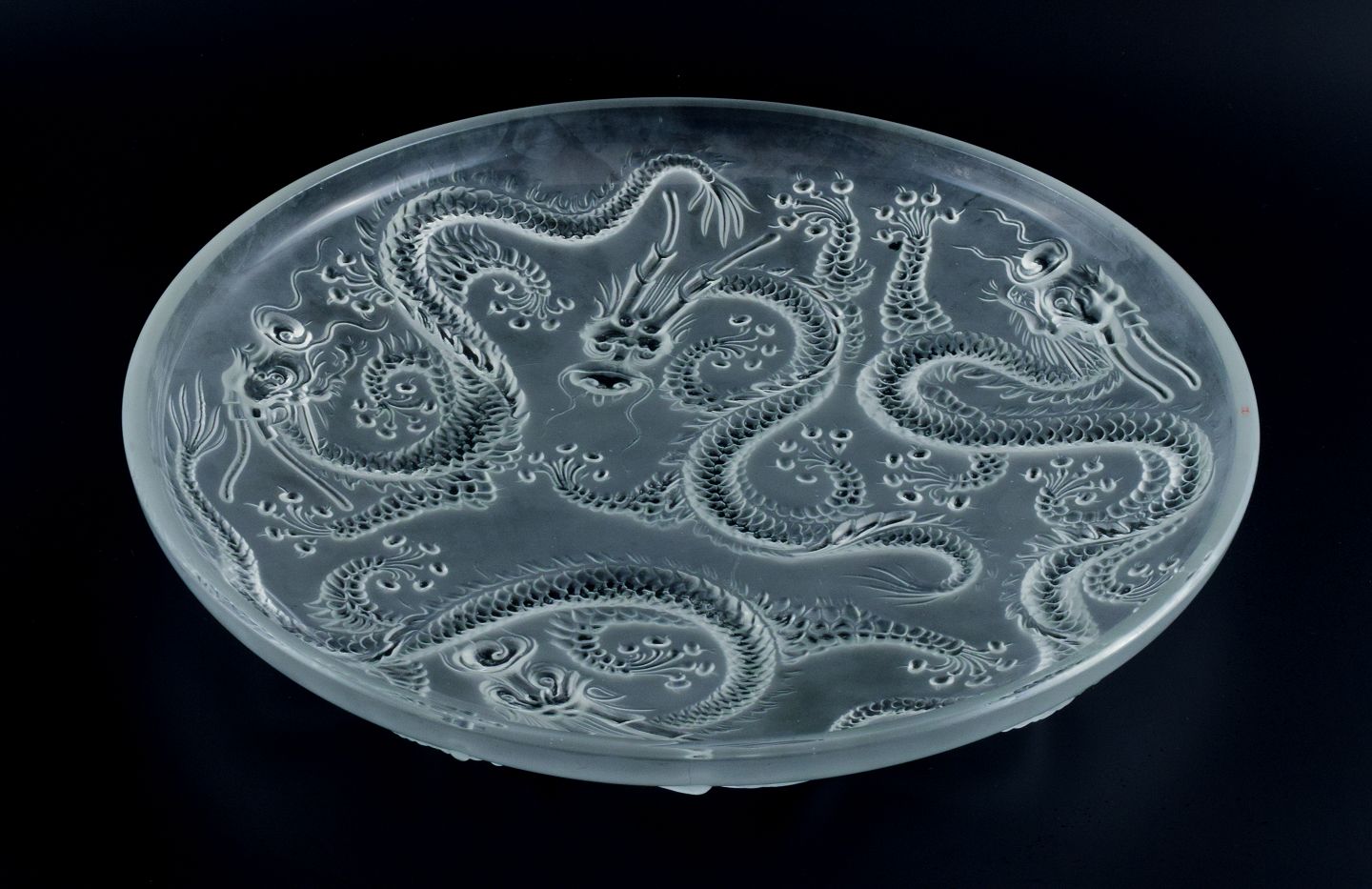 Josef Inwald, large art glass bowl in Barolac glass, designed with dragons in oriental style. Approx. 1940s. In perfect condition. Dimensions: D 35.5 x H 5.0 cm.