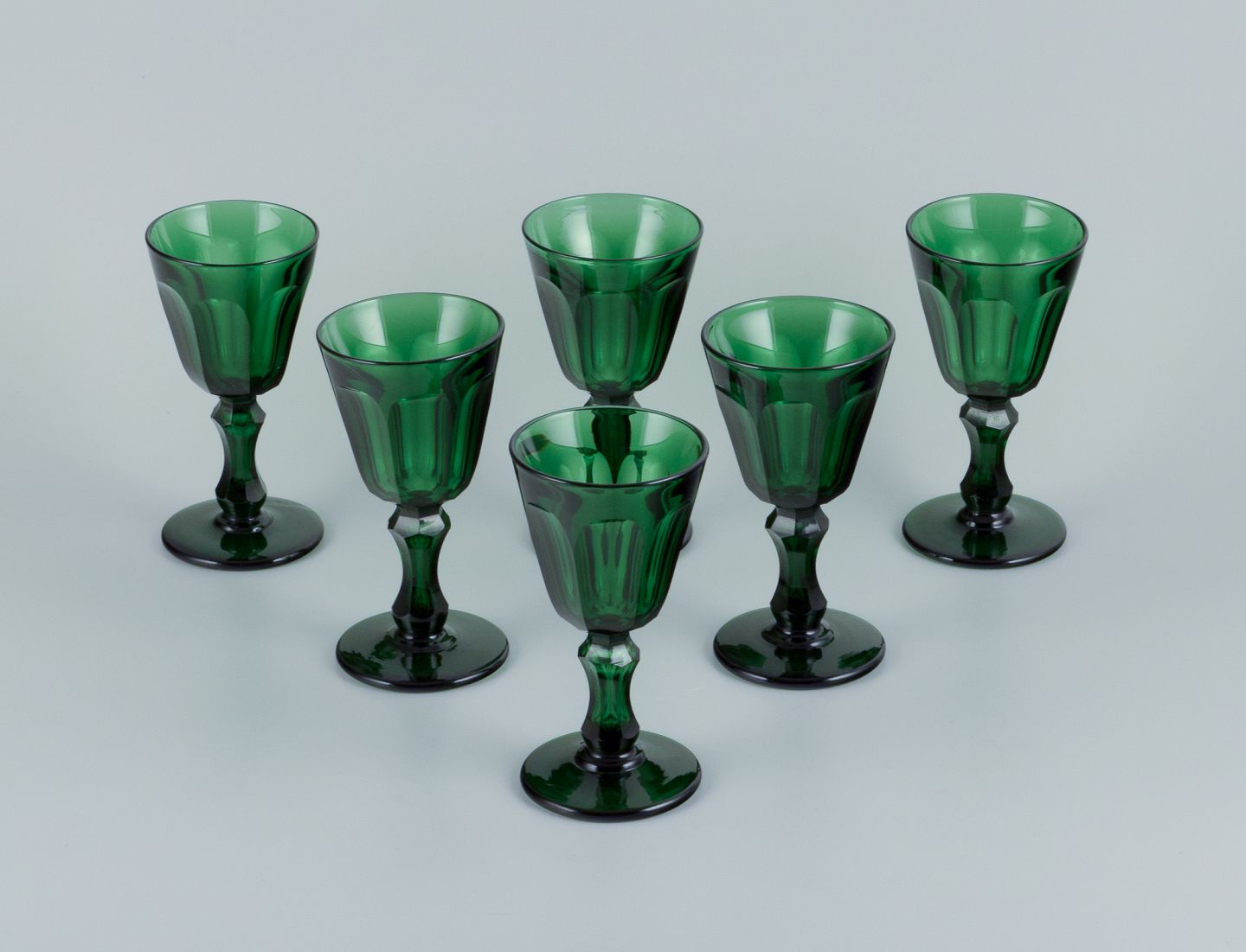 Val St. Lambert, Belgium, a set of six "Lalaing" white wine glasses in green crystal glass, faceted cut.