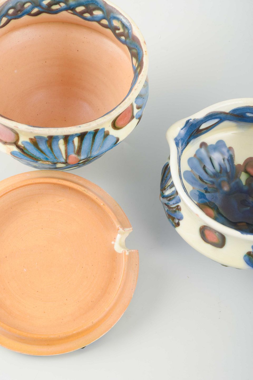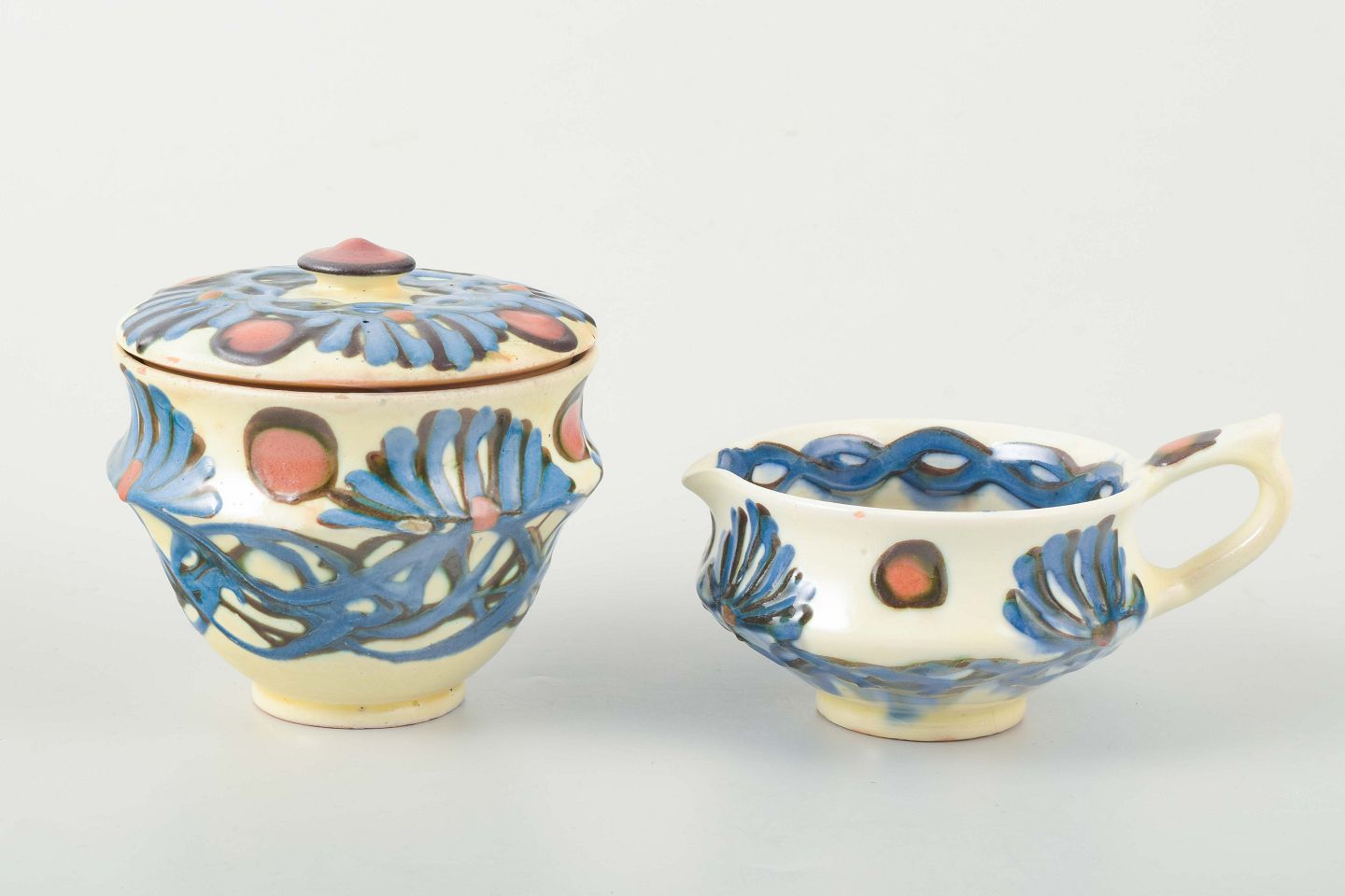Creamer and sugar bowl from the Marguerite service, glazed ceramics hand-decorated with polychrome floral and garland motifs in blue and reddish glazes on a light ground.