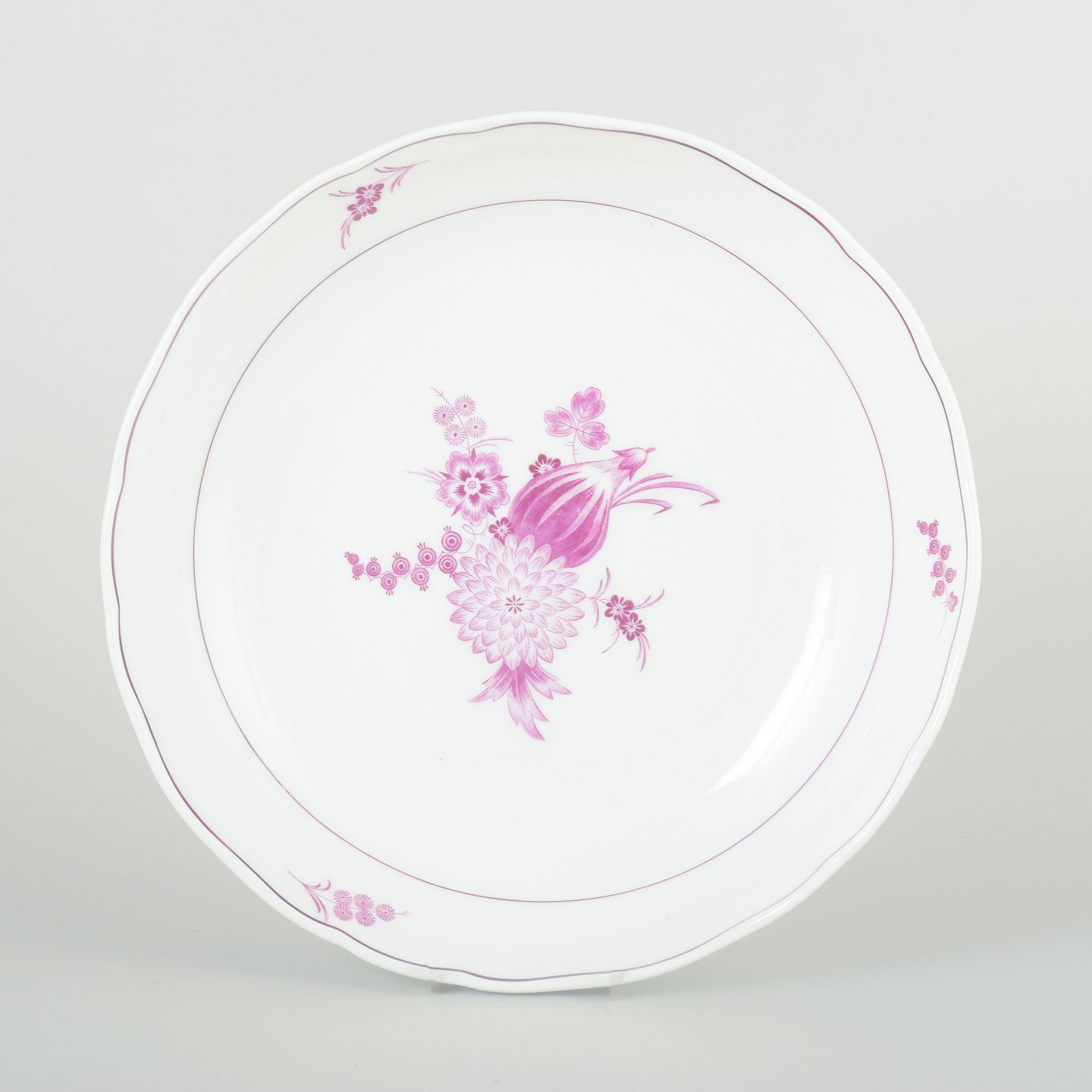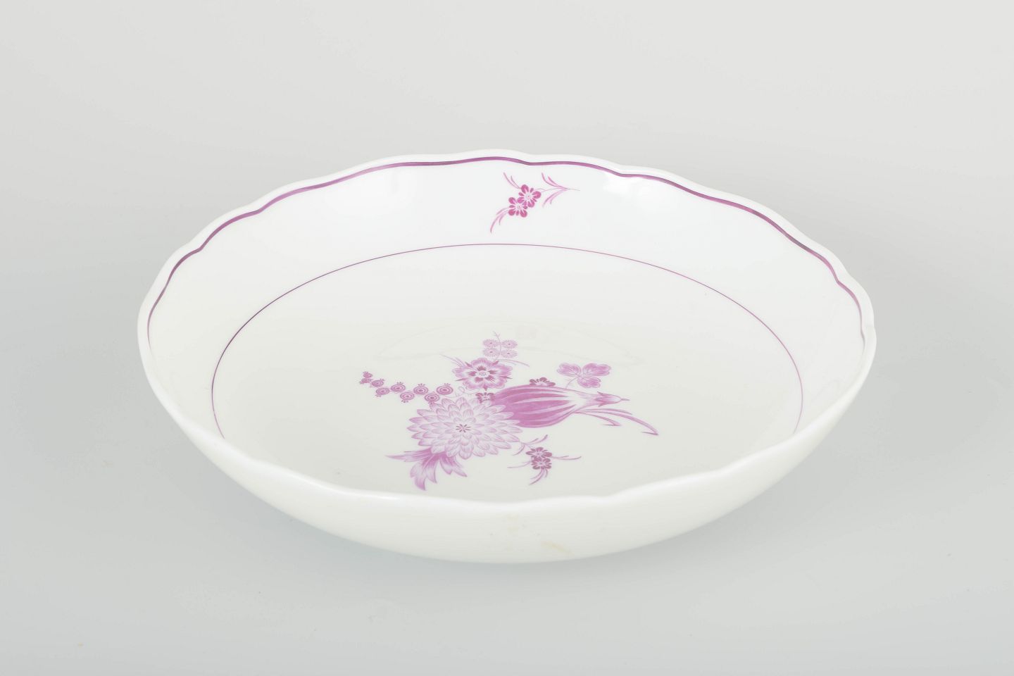 Hand-painted round porcelain bowl decorated with lilac floral compositions and a gently scalloped rim. Classic Meissen design with fine pink-lilac detailing.