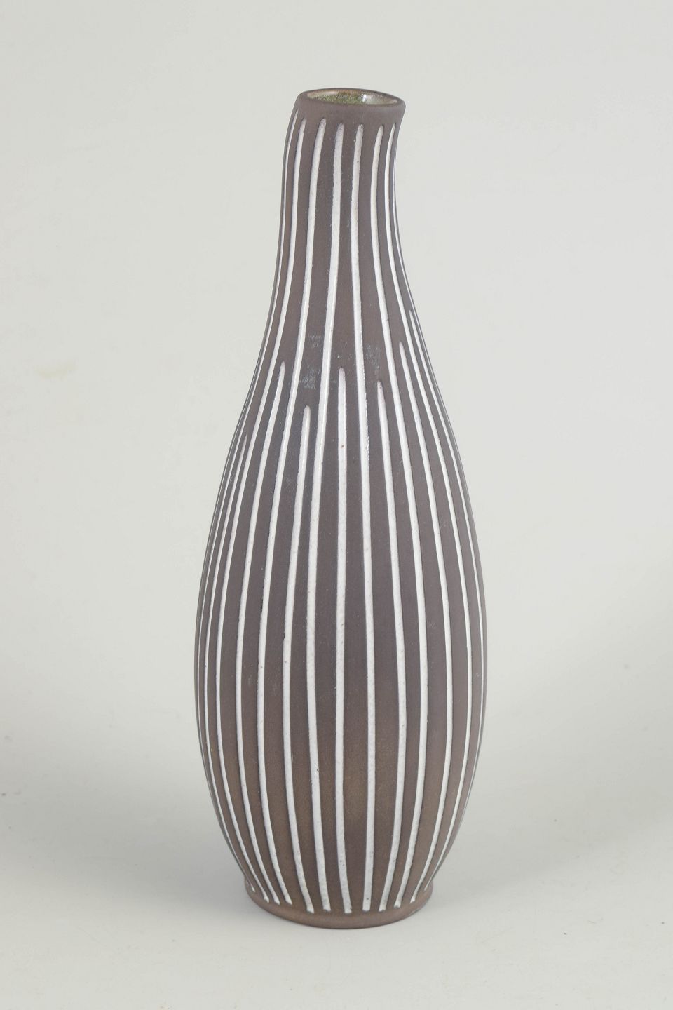 Slender, elongated stoneware vase with characteristic hand-painted white striped décor on a dark brown body. An elegant example of Nordic modernist design.