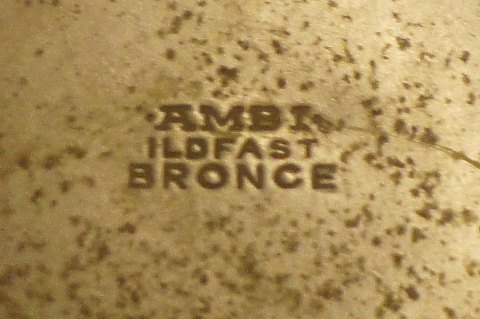 Stort "AMBI" ildfast bronce fad. 37 cm. i diameter. I god stand, lettere slidtage, lidt ridser. Motiv : Putti på sejlskib. Stemplet på bagsiden.