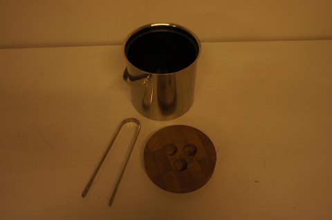 Stelton isspand med tang i rustfrit stål. Trælåg. 14 cm. høj. I god stand. Stemplet.