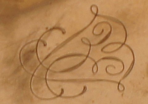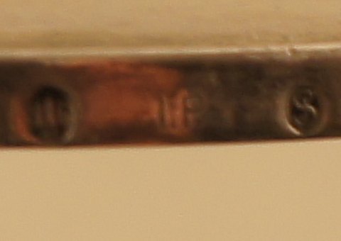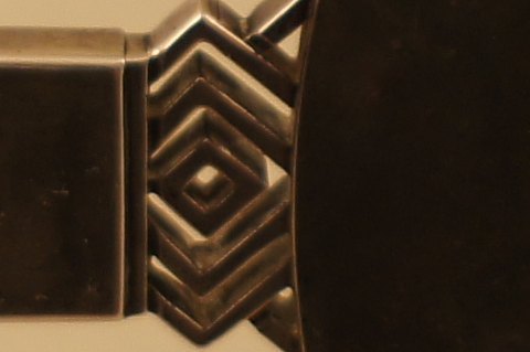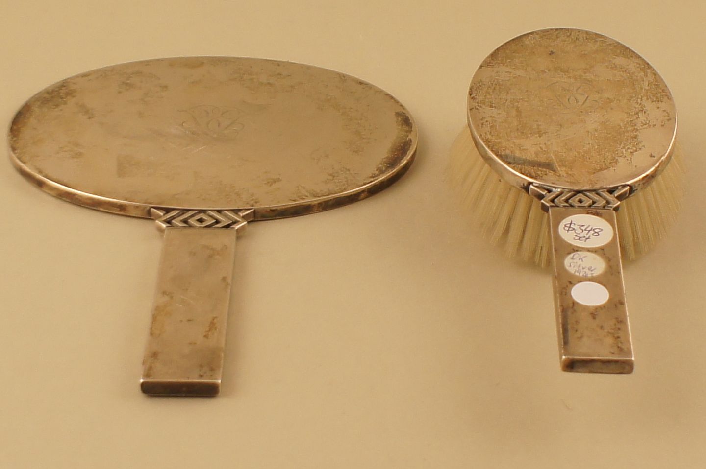 Dansk Art deco toiletgarniture af sølv bestående af spejl og børste. Ca. 1920. I god stand, ikke pudset. Stemplet med 3 tårne og "IP". Monogram (se foto) Spejl 21½ cm. langt.