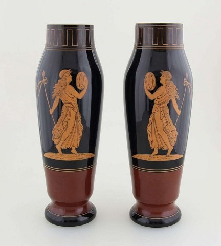 Sortlakeret hyalith glas med brun og okker emalje. Slank form med brunt mund-og halsområde. Vaser med græske motiver, impasto maling med sorte indvendige detaljer.