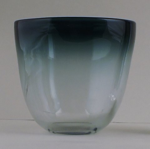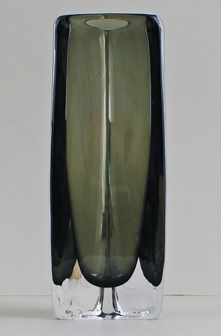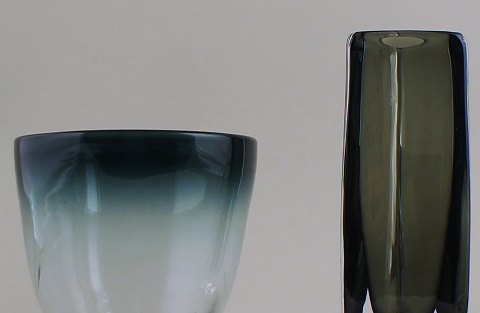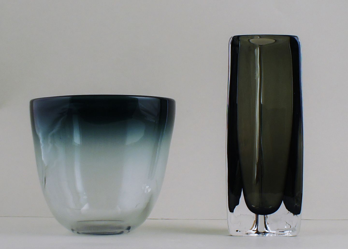 2 svenske kunstglas vaser, utydeligt signeret. Orrefors ? I god stand. Røgfarvet vase 23.5 cm. høj. Den høje vase er solgt.