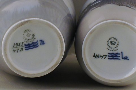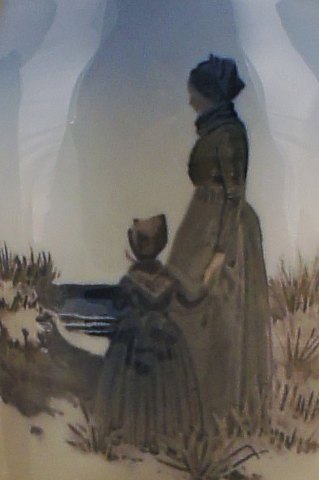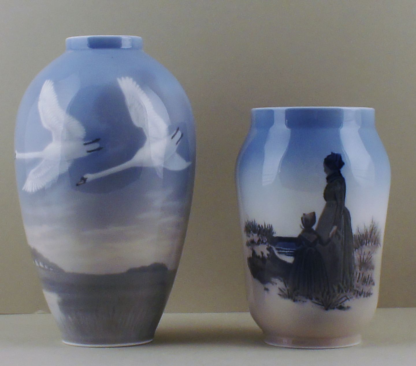 2 Royal Copenhagen vaser. Svaner i landskab og mor og datter i nationaldragter. 1. sortering, fejlfri. 22 cm. og 17 cm. høje.