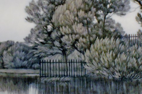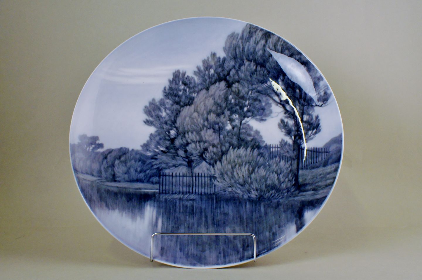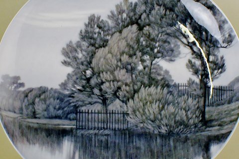 Large unique Royal Copenhagen dish by Stephan Ussing. Beautiful hand painted landscape. Factory first, in good condition. 40 cm. in diameter.