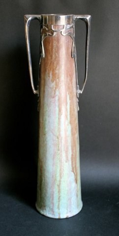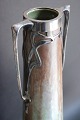 AUSTRIAN ART NOUVEAU WORK 1900 Stoneware vase in flamed glaze, silver plate stylish decor of plants forming the handles. Height: 36 cm. In good condition. Apparently unmarked.
