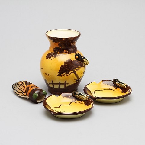 Massier Vallauris, Nice. Art Nouveau keramik, Frankrig. Tidligt 1900 tallet. Vase, 2 askebægre og en holder formet som et insekt. Stemplet: Nice, Massier Vallauris. Vasen er 18 cm. høj. I god stand. Priser fra 800 DKK pr. stk.
