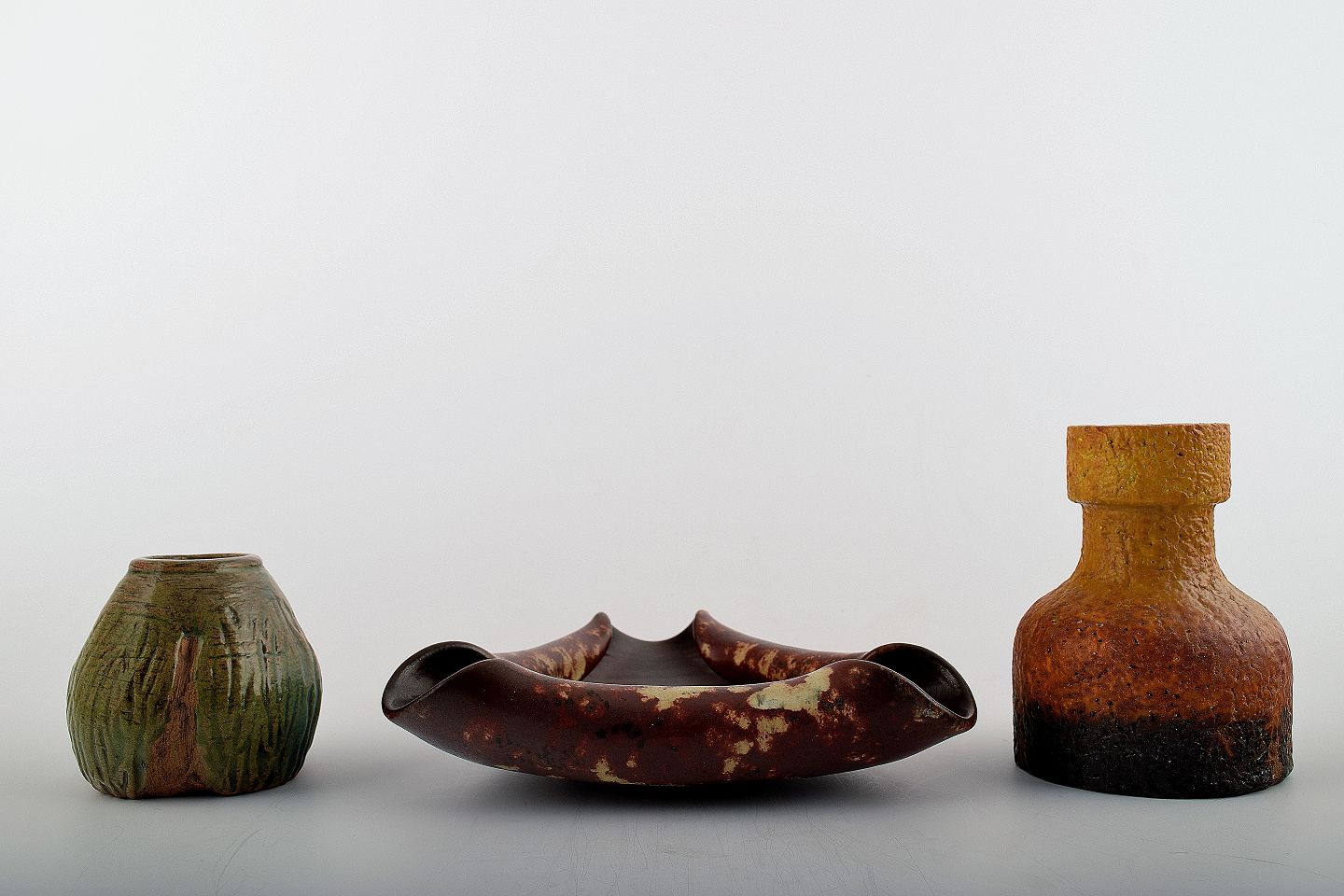 2 keramikvaser og keramikskål af Michael Andersen. Stemplet "EH" og "Italy" samt Michael Andersen stempel. Måler : 11 cm, 7.5 cm. Skål 17 cm. i diameter.