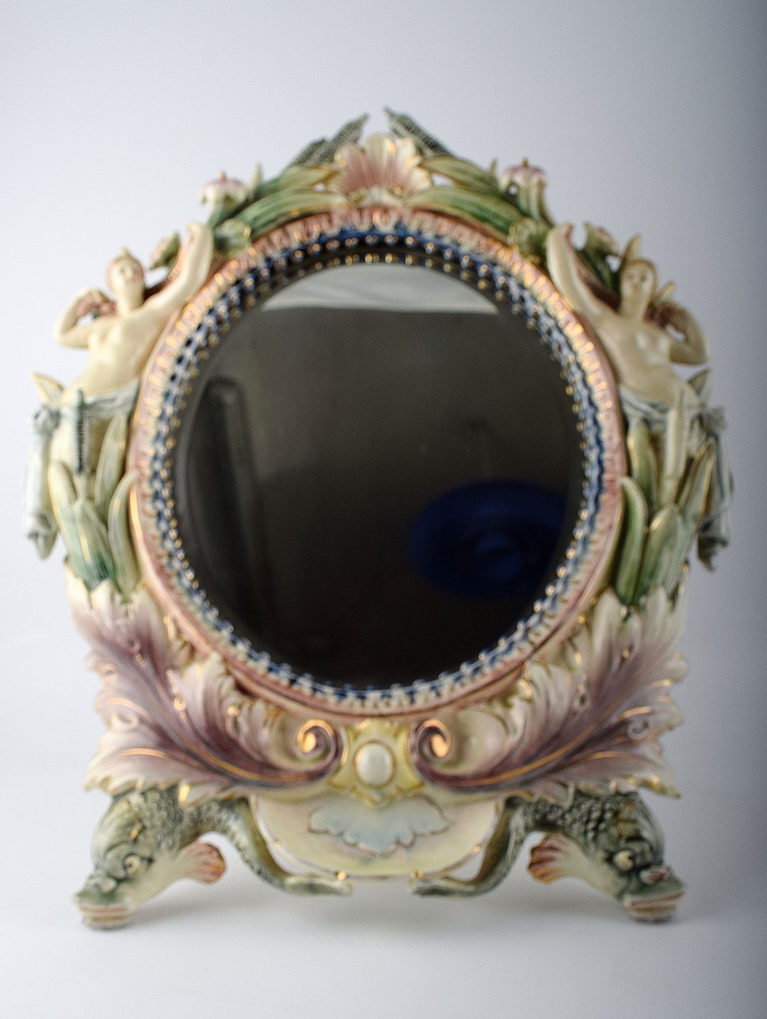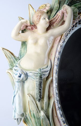 Bordspejl i porcelæn, ustemplet. Dekoreret med kvinder og blomster, håndmalet.