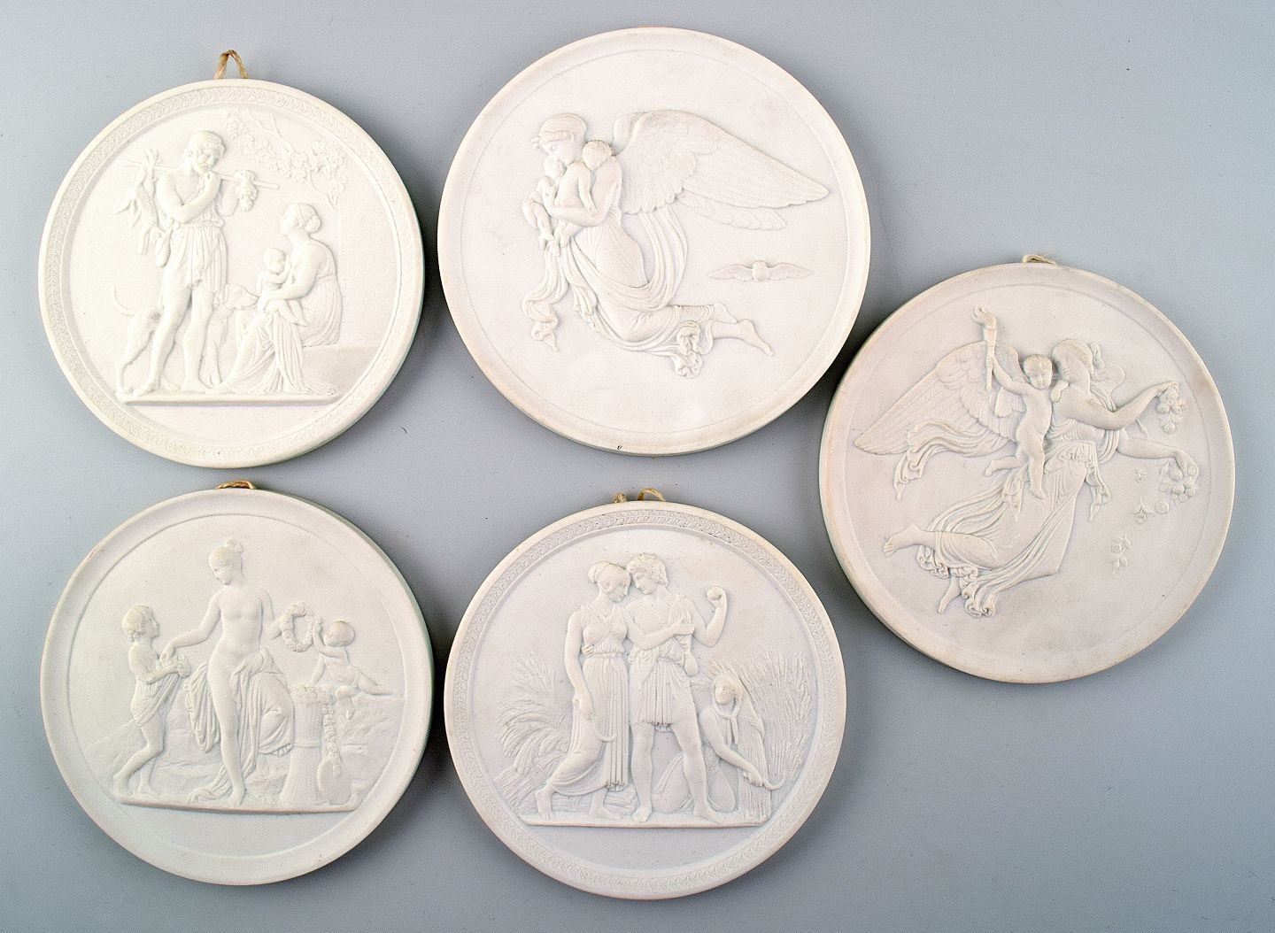 5 Royal Copenhagen biscuit plaques after Thorvaldsen. Measures 13.5 to 15 cm. Hallmarked. In perfect condition, 1st. factory quality.