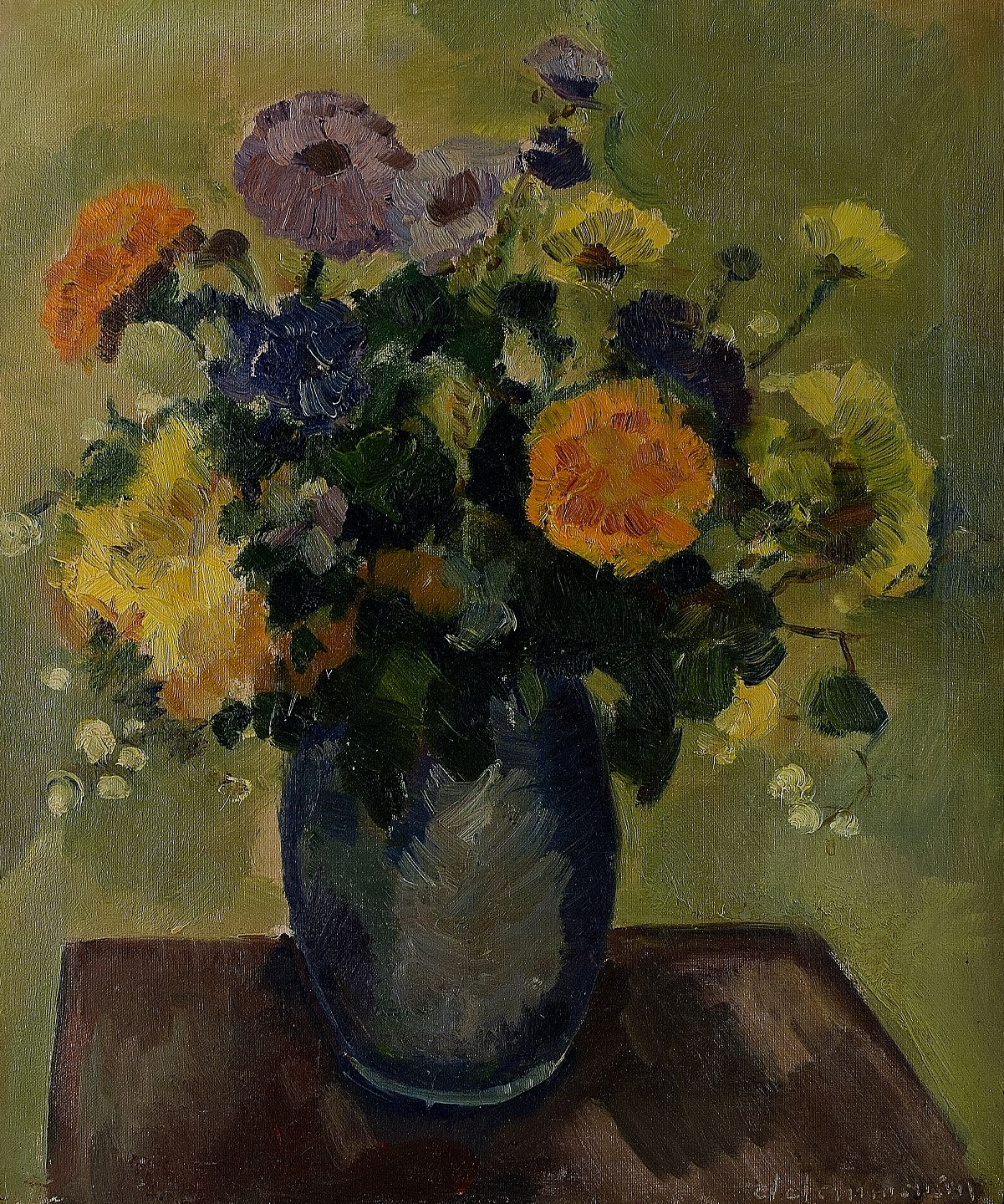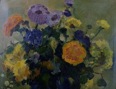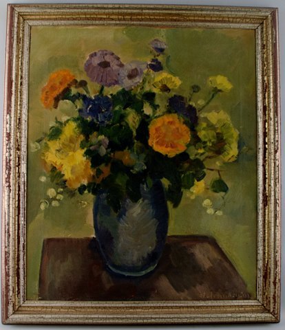 Clemmen Jeppe CLEMMENSEN (1885-1964) Blomsteropstilling, olie på lærred. Måler 49 x 59 cm. Rammen måler 5.5 cm. Signeret, ca. 1930´erne. I flot stand.
