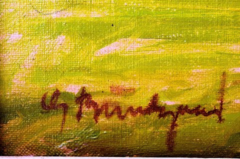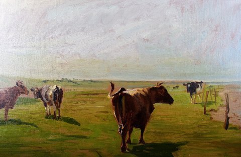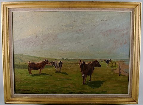 Gunnar Bundgaard (born Aalborg 1920, d. 2005): Cows on field. Signed G. Bundgaard. Oil on canvas. Measures 48 x 68 cm. In perfect condition. The gold frame is 6 cm. wide.