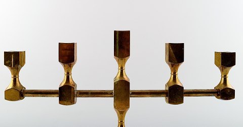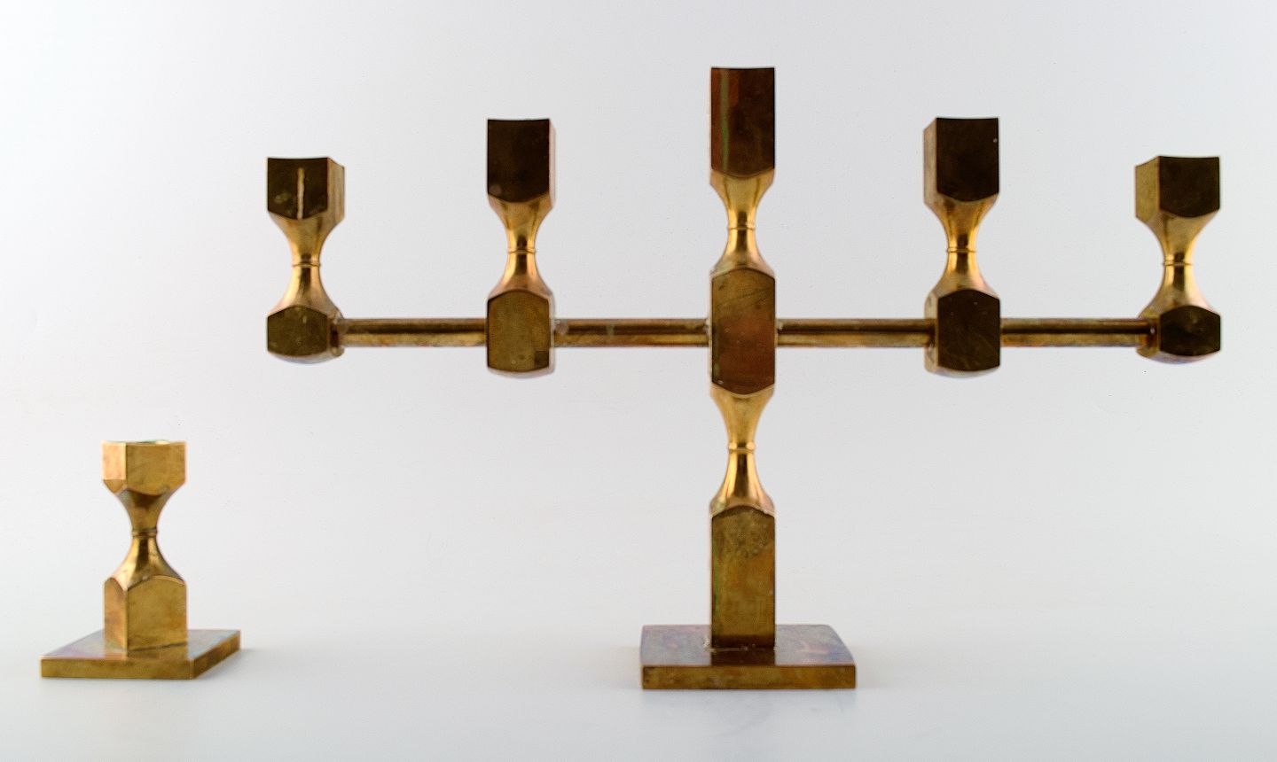 Gusum metal, 2 stager i messing. Svensk design. Måler : 37 x 23 cm. Lille lysestage 9 cm. I perfekt stand.