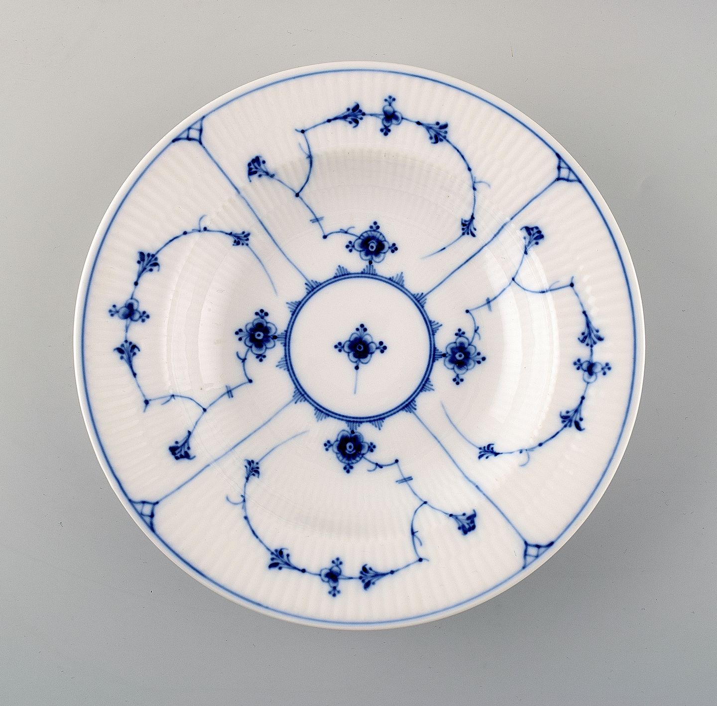 Royal Copenhagen blue Fluted Plain soup/pasta dish. Number 1/167. Early mark. Measures 23.3 cm. x 6 cm. In perfect condition, 1st. factory quality.